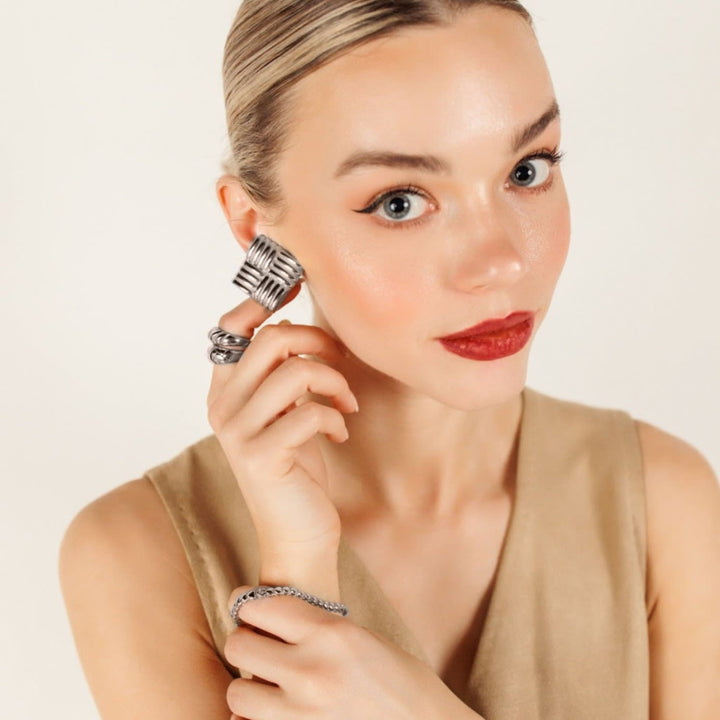 These Asha Square Textured Earrings in Silver by Viea bring bold elegance with a tropical twist. Their woven-like linear detailing creates a striking texture, making them the perfect statement pieces to elevate any look. Strong yet refined, they embody the effortless glamour that transitions seamlessly from day to night. Designed as standout staples, they add depth and dimension to every jewellery collection.