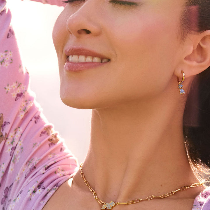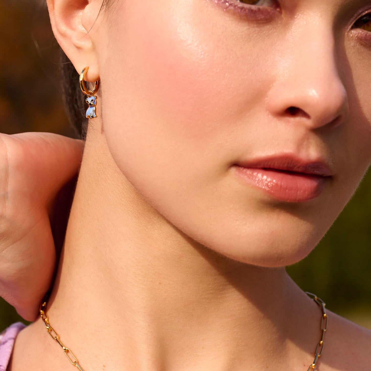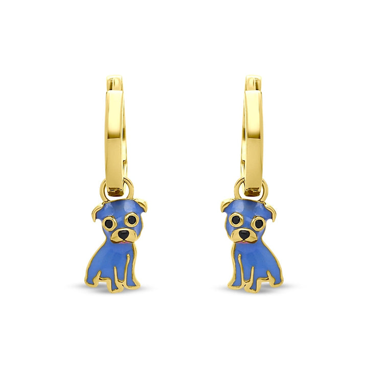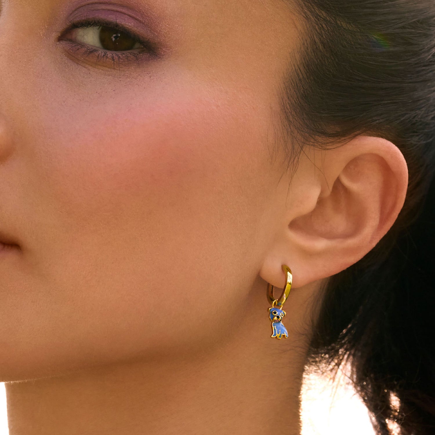 These hoops are made from 24-karat gold-plated brass. They feature a blue pit bull charm painted with enamel and are convertible, allowing them to be worn with or without the charm.