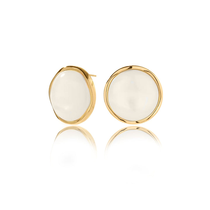 These stud earrings are crafted from high-quality brass with an 18k gold coating. The centerpiece is a natural shell. They are hypoallergenic, waterproof, and non-tarnish.