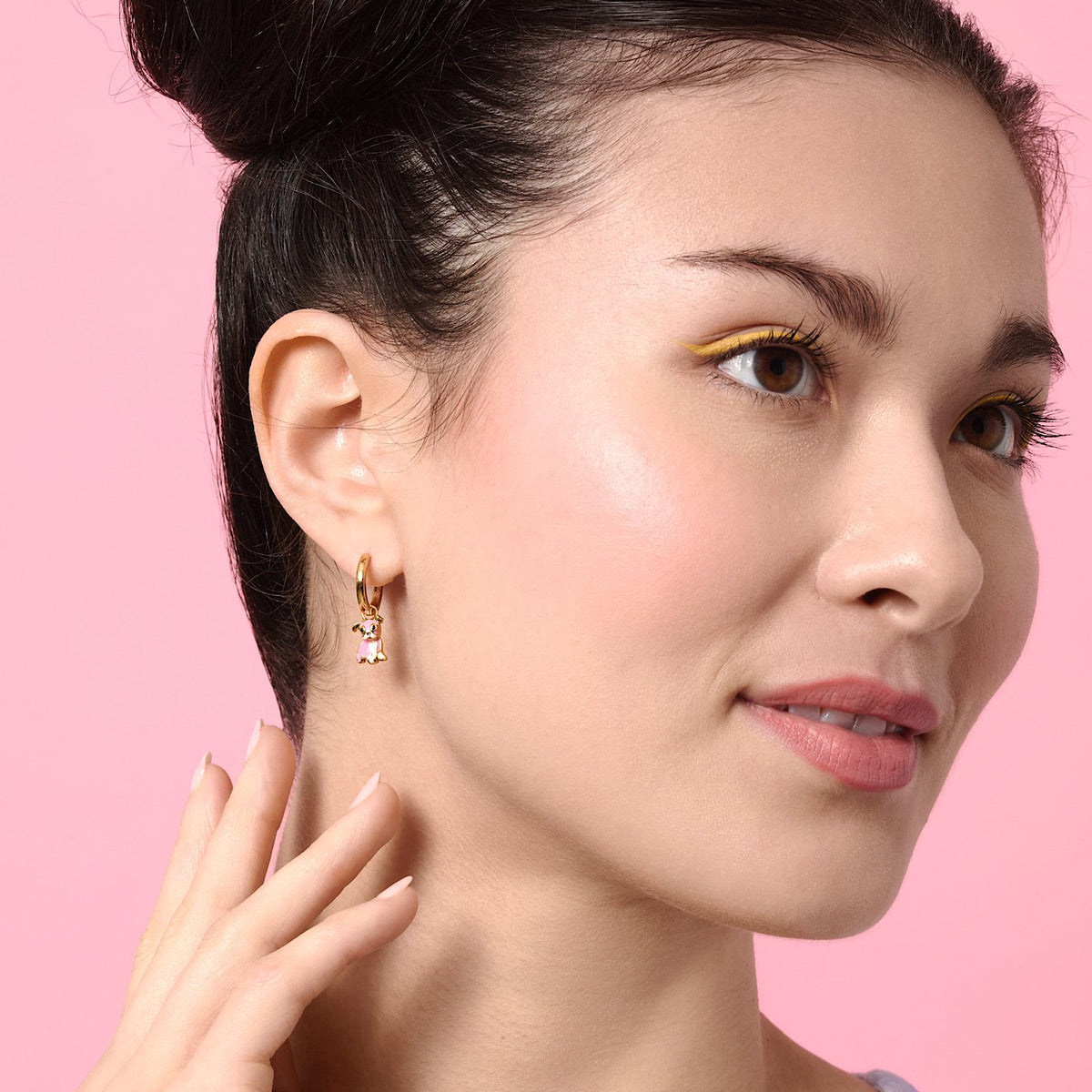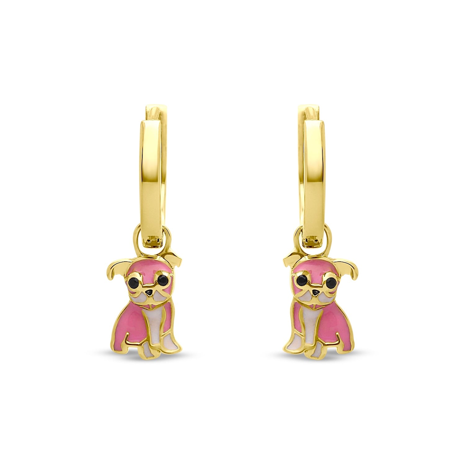 These hoops are made from 24k gold-plated brass and feature a pink bulldog painted with enamel.