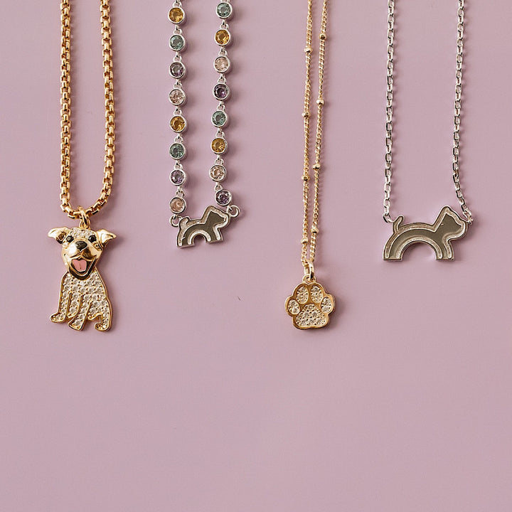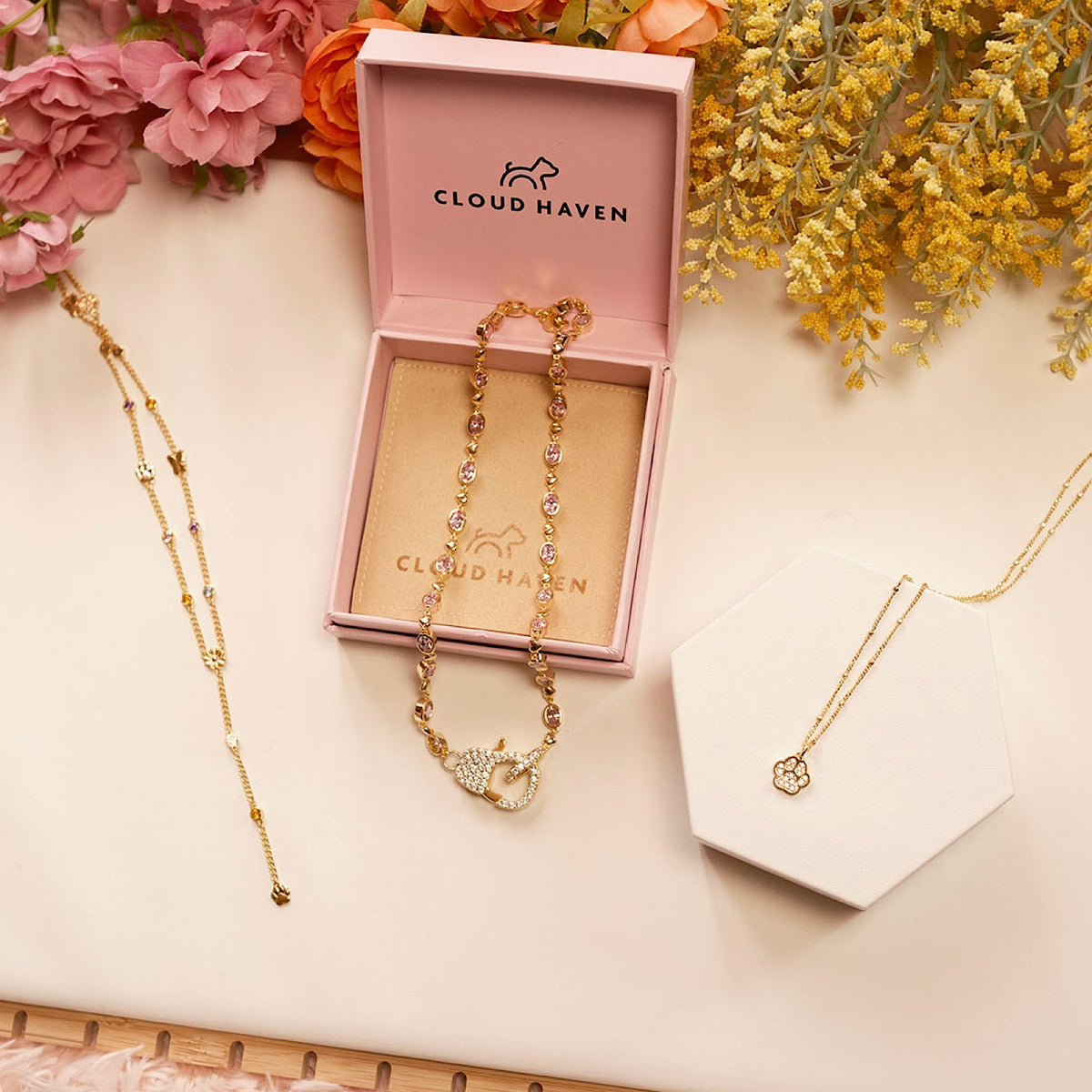 This Cloud Haven White Paw Print Choker Necklace by Cloud Haven is a sweet and delicate accessory that adds a playful touch to your style. The dainty chain is centered around a charming paw print pendant, which features sparkling cubic zirconia stones. This whimsical and elegant piece is perfect for daily wear, symbolizing love for a furry friend. Its delicate design makes it ideal for layering with other necklaces or wearing on its own for a subtle, personal statement.