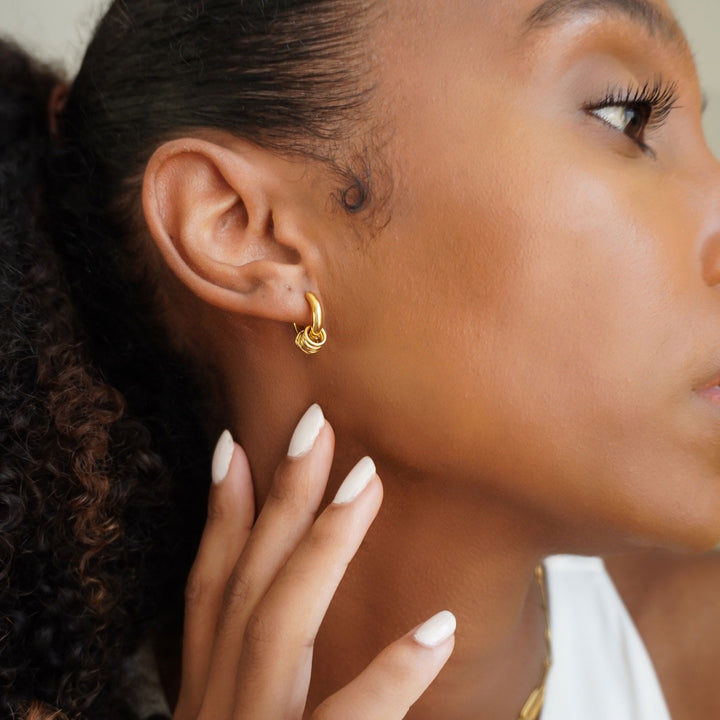 Crafted from durable, oxidising-free stainless steel plated in gold, these hypoallergenic and waterproof hoops feature five metal loops and a secure click-to-lock closure.