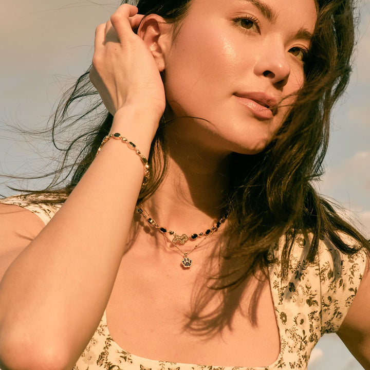 This choker is made from 24k gold-plated brass. It features a 15" chain with a 2" extender and a 3/8" pendant with a black cubic zirconia base and a lobster closure.