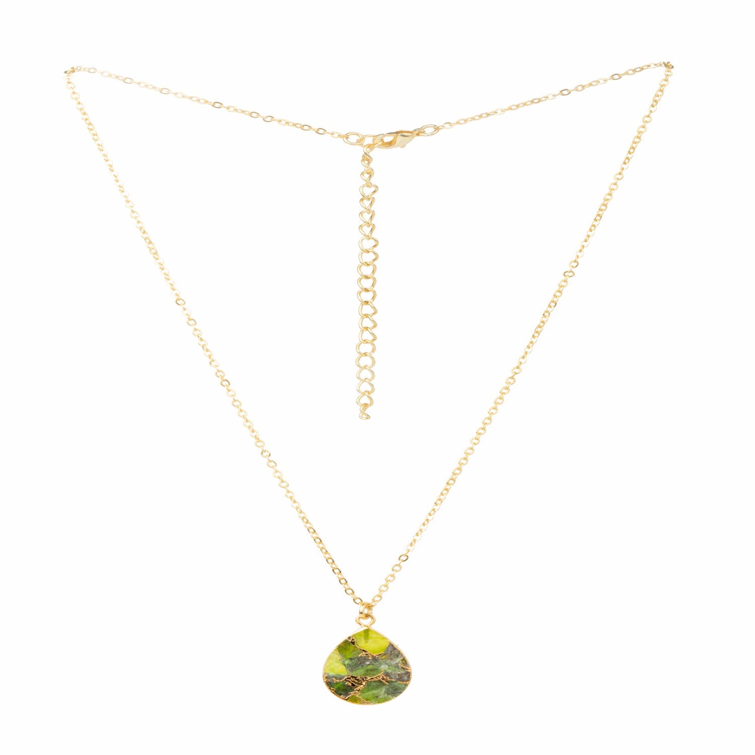 This necklace features a Mojave Turquoise stone and is crafted from brass with 18K gold plating. The stone is 0.75 inches, and the chain is 16 inches long with a 3-inch extension.