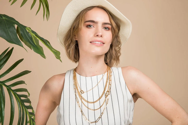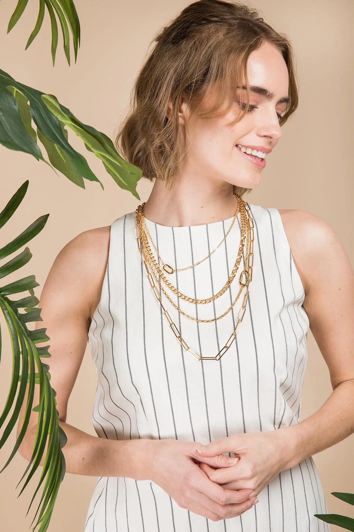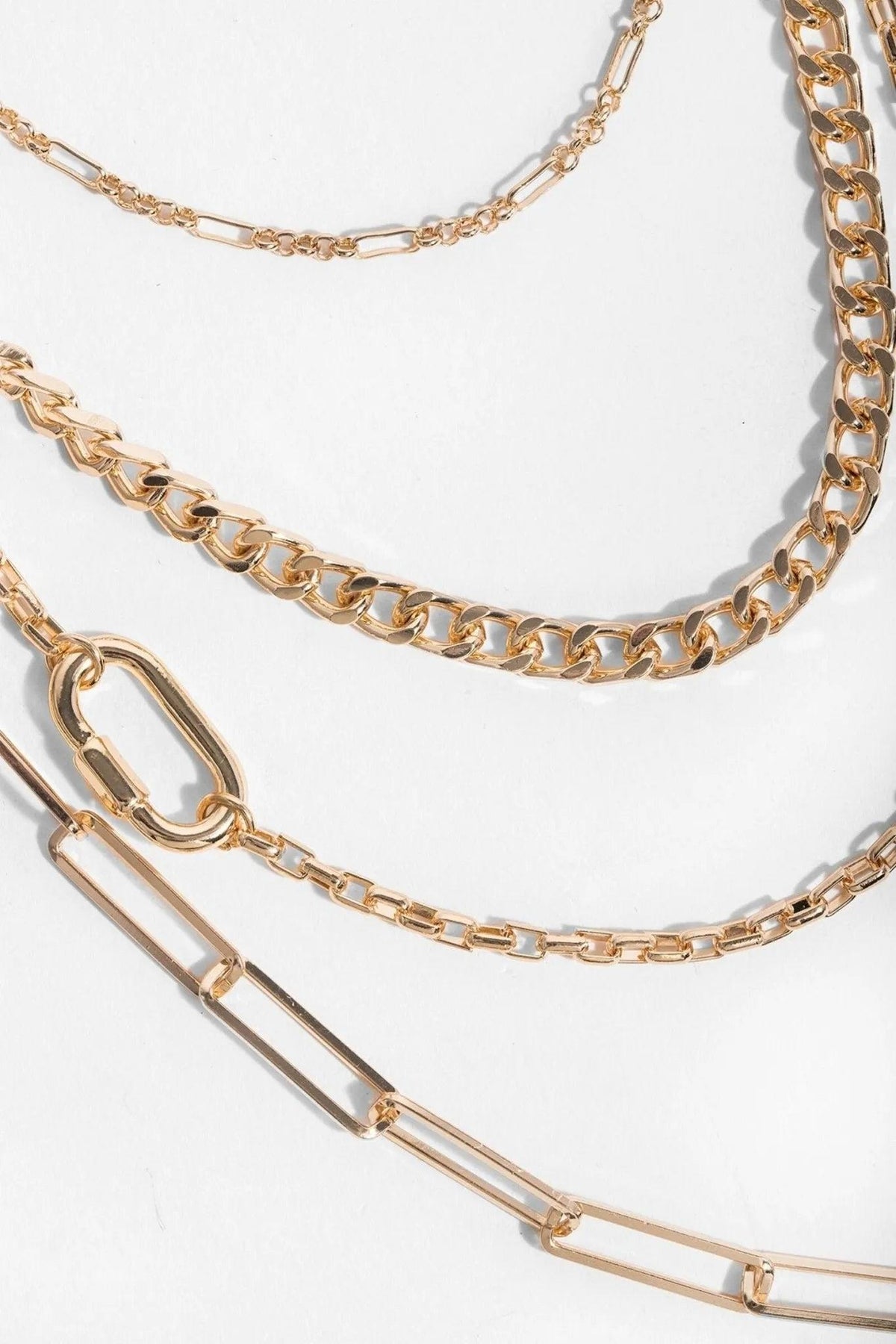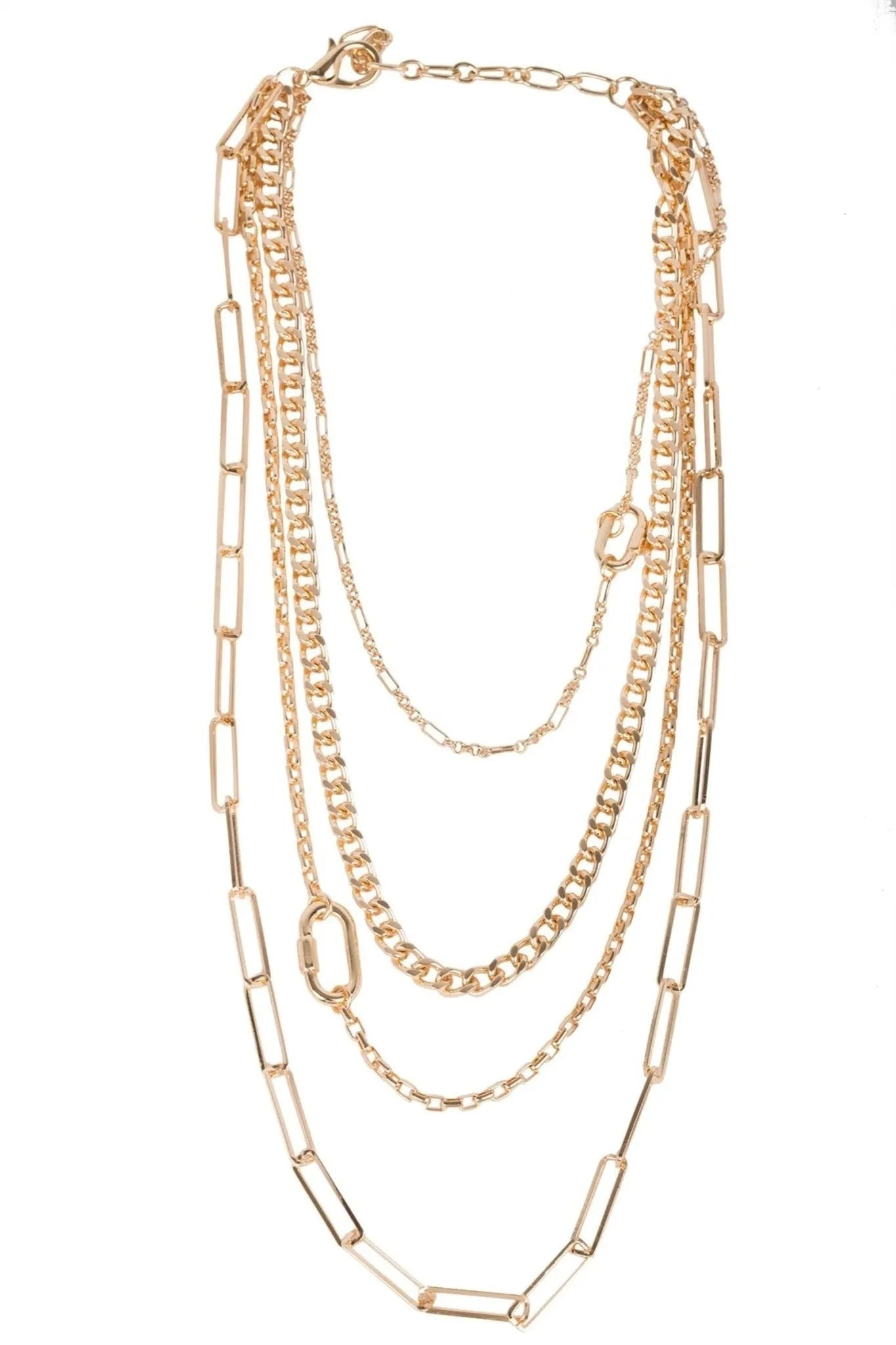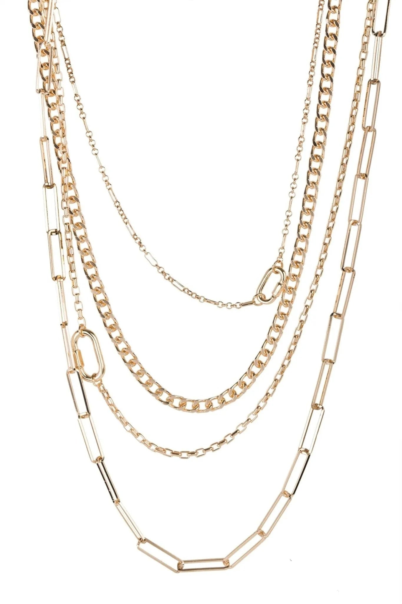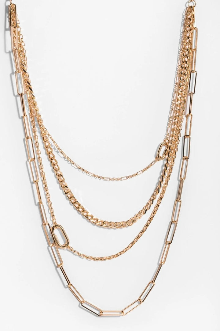 This Layered Gold Chain Multi Necklace by Saachi is a modern and elegant accessory. It features four gold link chains stacked together to create a trendy and layered look. This necklace is perfect for pairing with your favorite gold accessories for a coordinated ensemble or for dressing up a simple T-shirt and jeans.