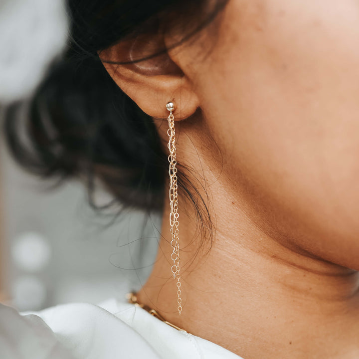 These Salma Gold Chain Drop Earrings by Herself Collections are elegant and dramatic. Sold as a pair, they are composed of three different chains that catch the light. Made from 14K gold-filled material, they are a high-quality, long-lasting alternative to solid gold. They will not tarnish or fade with normal wear for years.