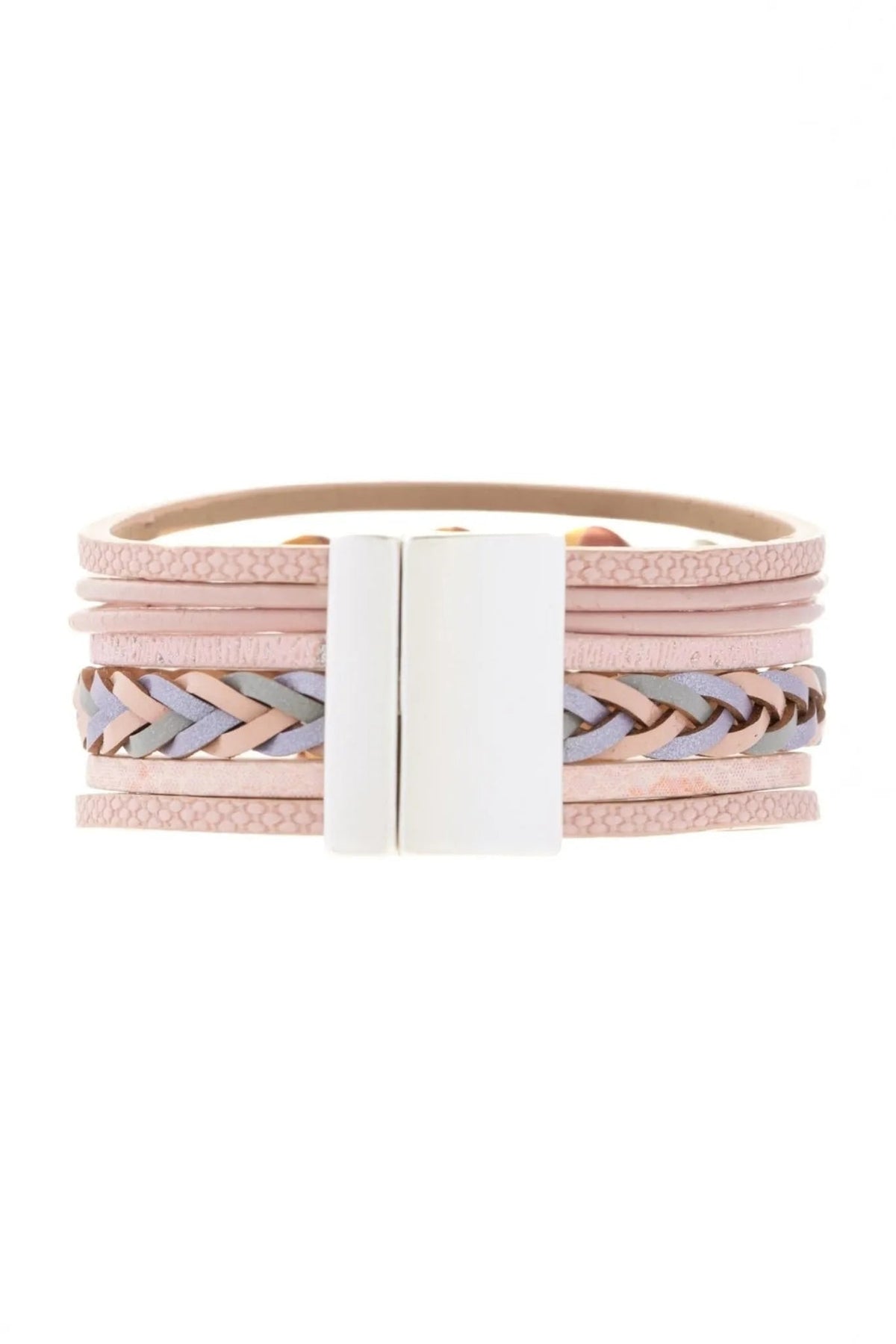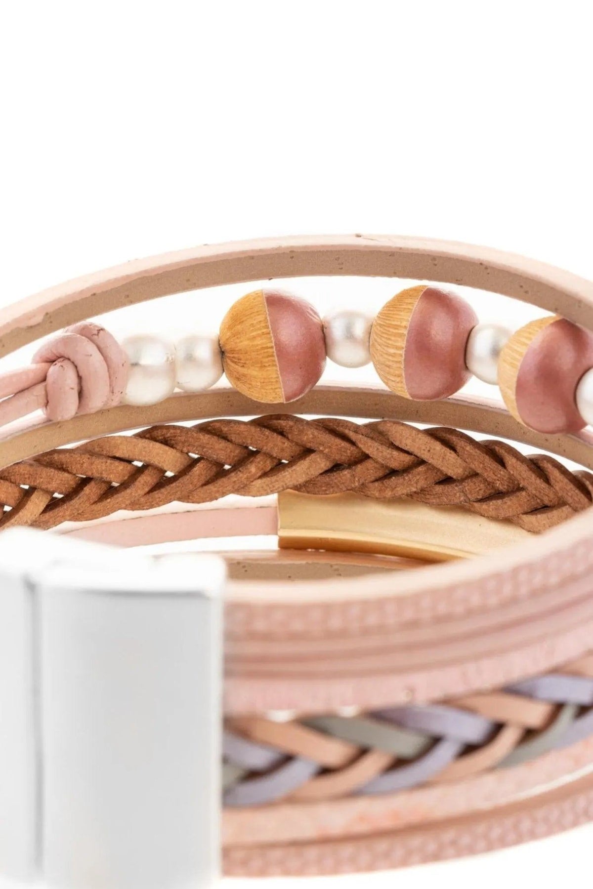 This bracelet is made from wood beads, vegan leather, real leather, and zinc alloy, with a magnetic clasp. It is 7.75 inches long.