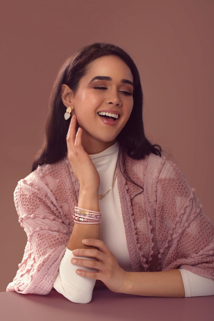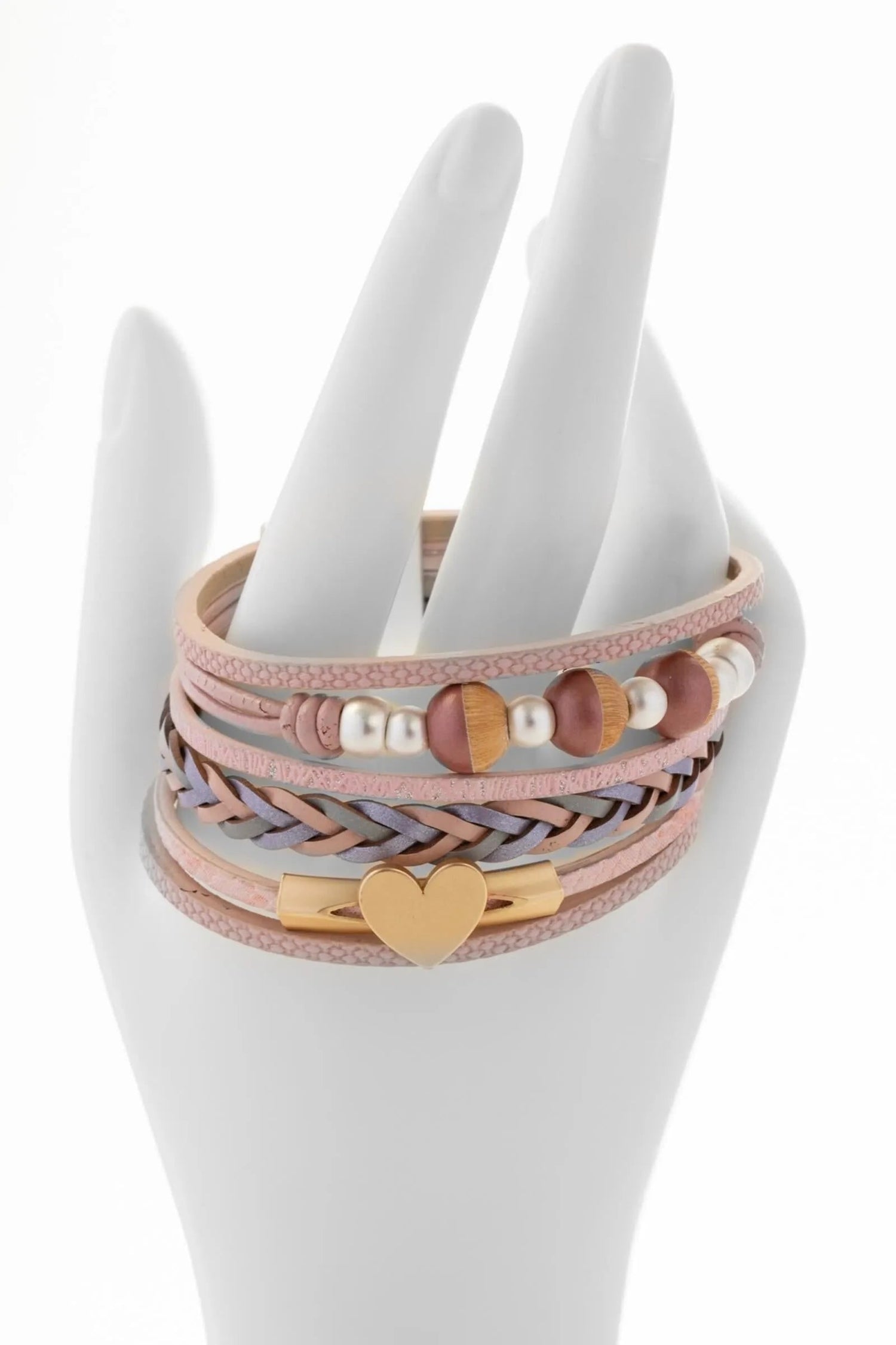 This Leather Wooden Beaded Bracelet by Saachi is a stylish blend of natural and modern elements. The combination of wooden beads and braided leather creates a unique, textured look, while the gold heart charm adds a touch of charm. This versatile bracelet effortlessly elevates any outfit from work to weekend.
