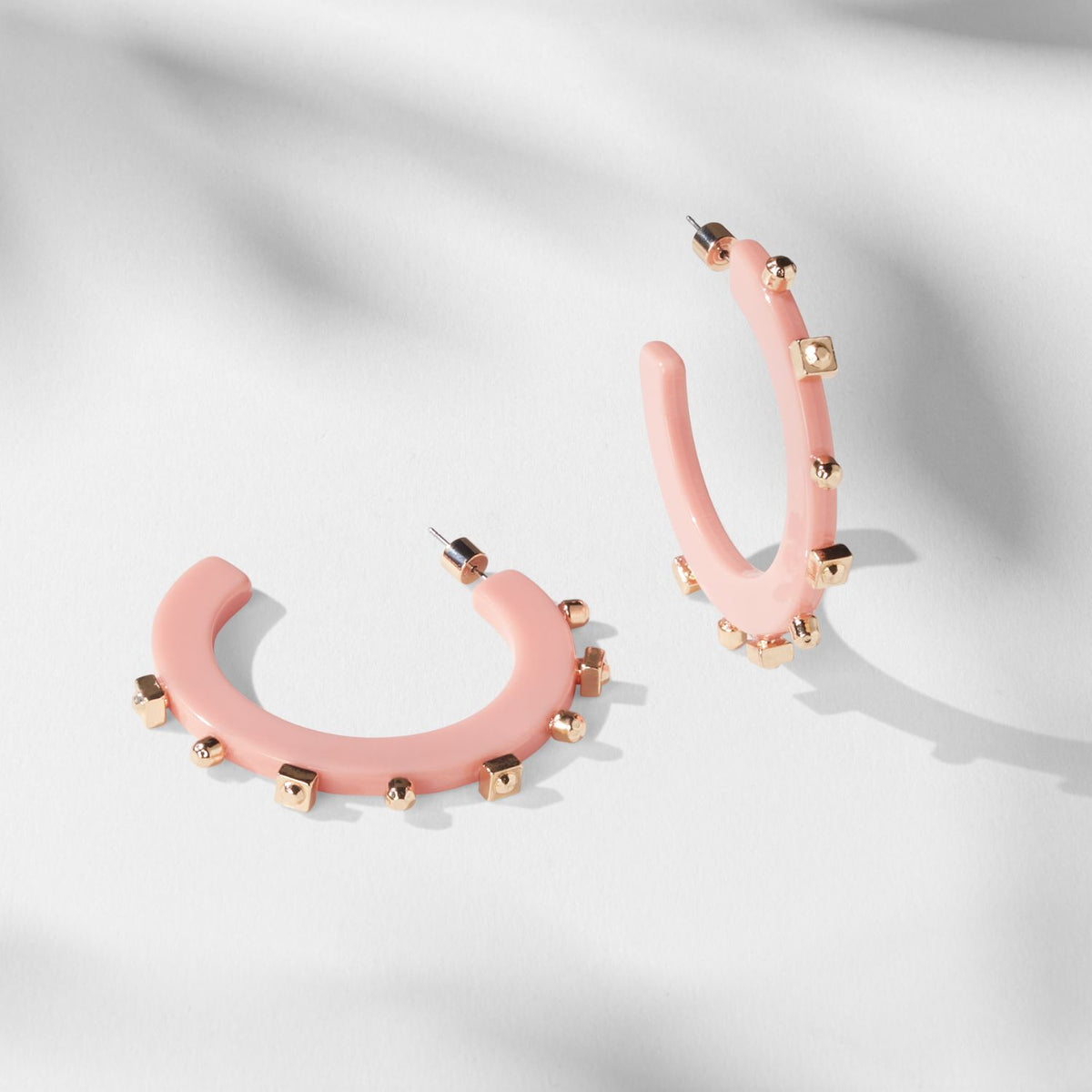 These small hoop earrings are made of lightweight, thick acrylic. They feature solid gold jewel stones and a surged steel post. The earrings are eco-friendly, lead-free, nickel-free, and corrosion-resistant. They should be kept out of direct sunlight.