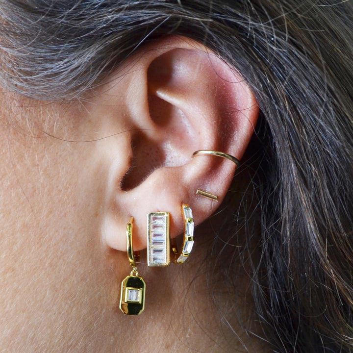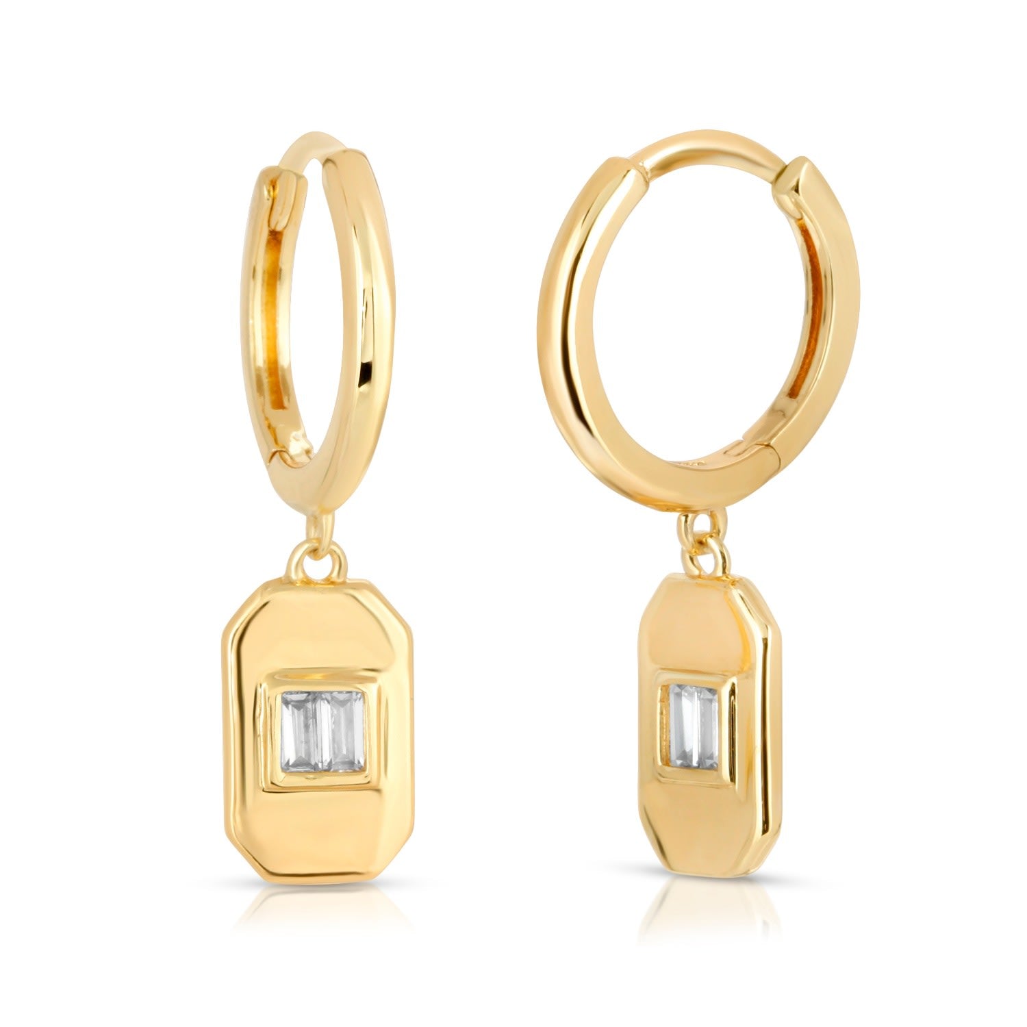 These huggies are crafted from tarnish-resistant, heavy 14K gold over brass and feature a dangling clear baguette cubic zirconia.