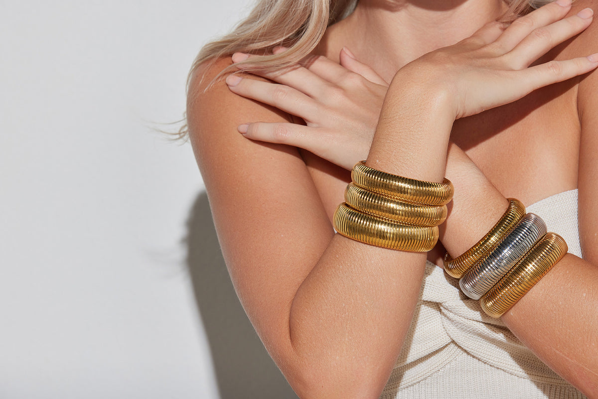 This stretch bangle is handmade and crafted from 14k gold-filled stainless steel. It has a width of 20mm.