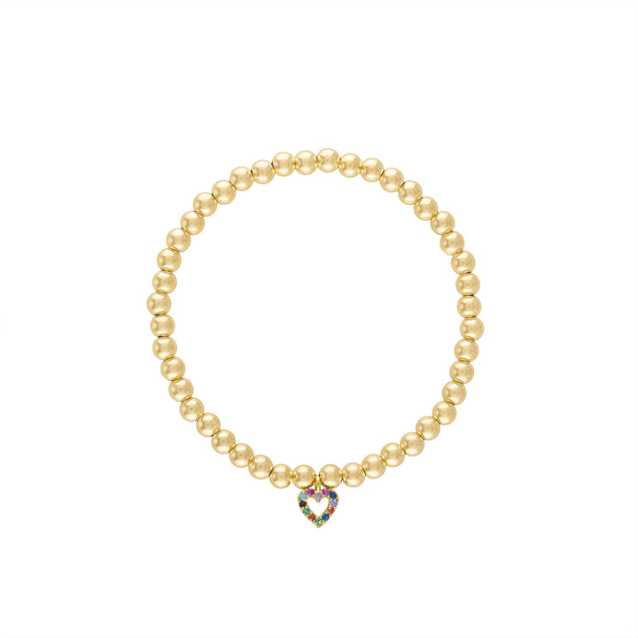 This stretch bracelet is handmade with 14K gold-filled 4mm beads. It is available in 6.5 or 7 inches and features a gold-plated rainbow pave heart charm.