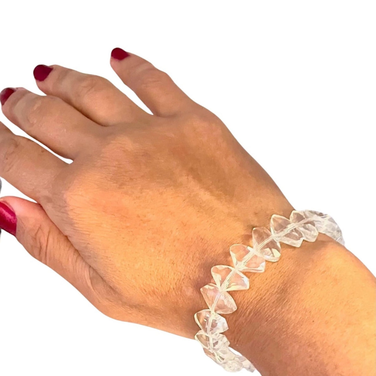 This Clara Clear Faceted Crystal Bracelet by Amy Delson Jewelry is a mesmerizing accessory that will sparkle with you day and night. The light, faceted crystal beads resemble ice, creating a beautiful and elegant look against your wrist. This vintage-inspired bracelet is perfect for adding a touch of timeless glamour and shine to any outfit.