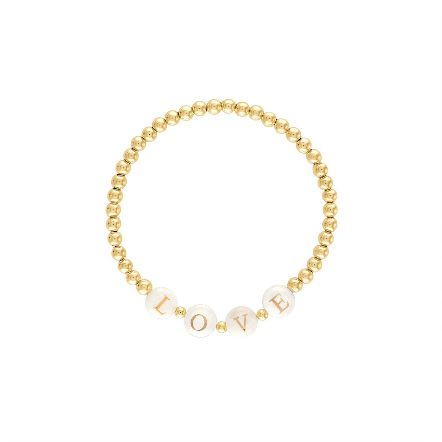 This bracelet is handmade from 14K gold-filled 4mm beads and mother-of-pearl shell letter beads. It is available in a 6.5" or 7" stretch fit.