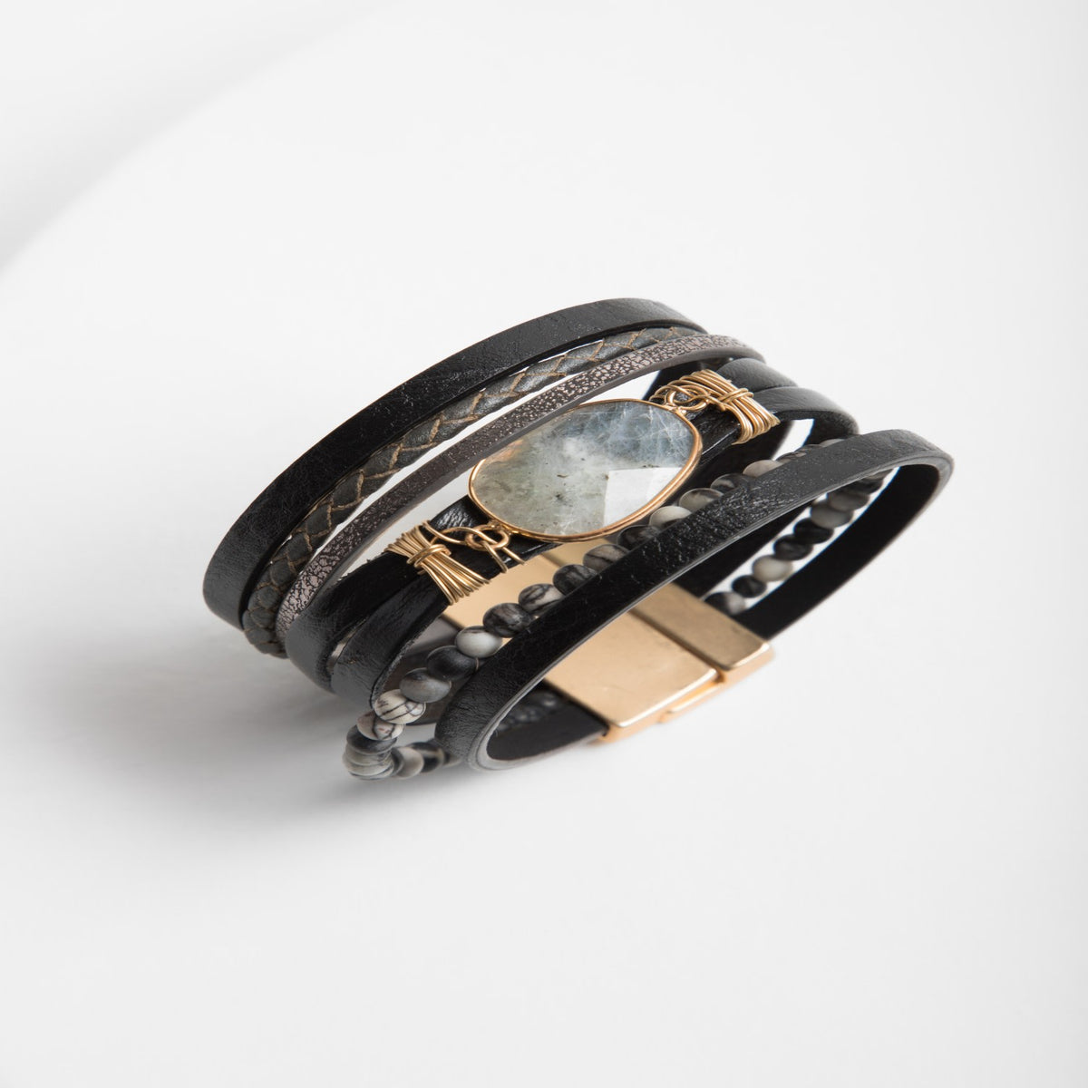 This bracelet is made from matte fine gold, black leather, and grey natural stone, with a labradorite centerpiece. It is 7.5" in length with a width of 1.5" and has a magnetic clasp.