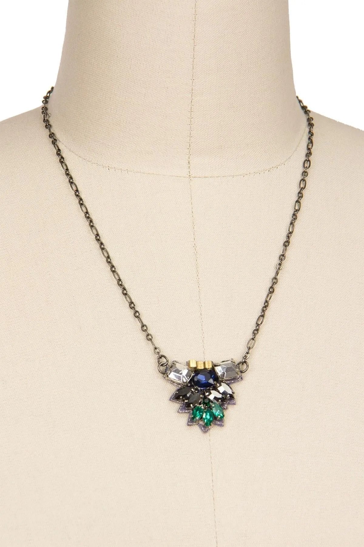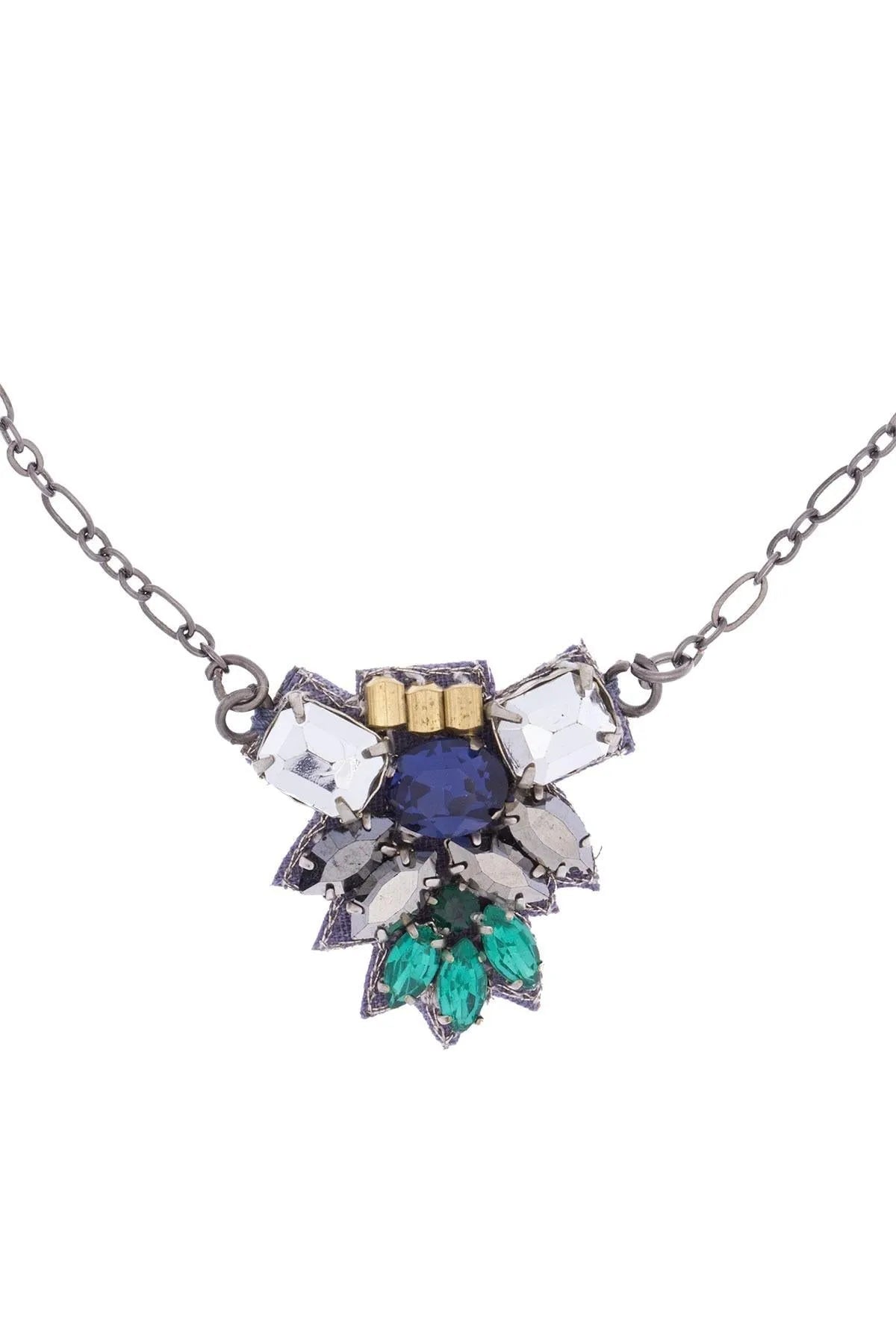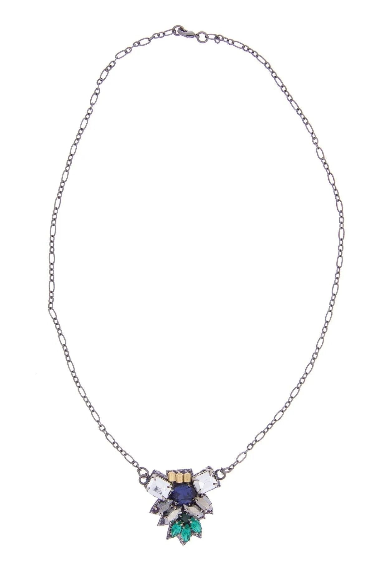 This Modern Mosaic Crystal Pendant Necklace by Saachi is a work of art you can wear. The copper chain, with its mosaic-styled and black polished design, leads to a bold pendant composed of an emerald sapphire, surrounded by glass and copper beads. This necklace adds an artistic touch of sparkle and is the perfect finishing touch for a statement look.
