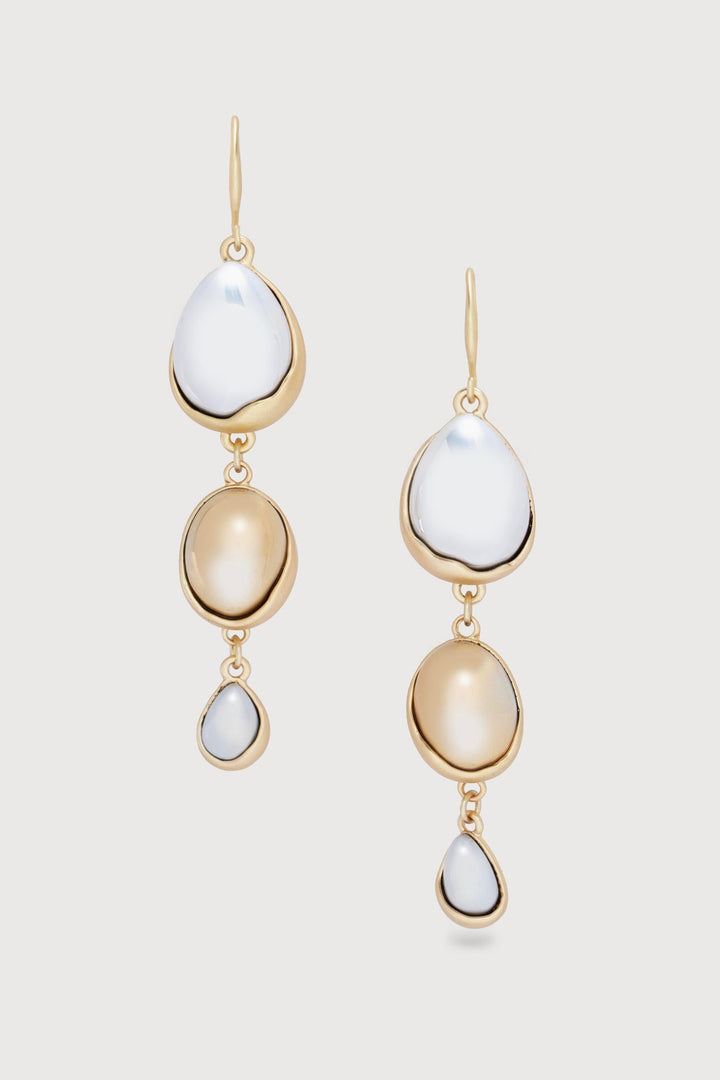 These earrings feature three colored glass orbs encased in a matching setting and closure. They are made of matte fine gold, white, and yellow materials.