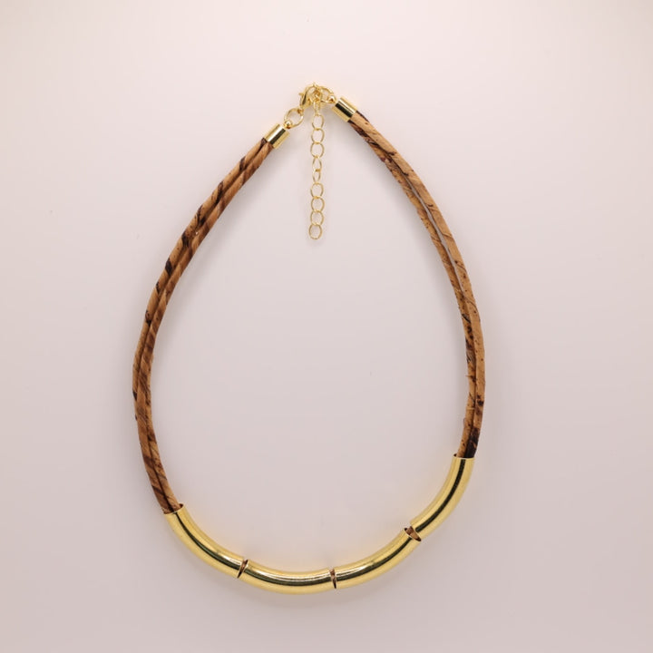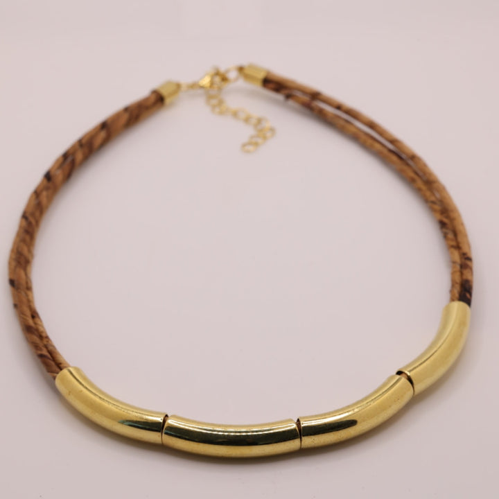 This necklace is made with natural banana fiber and gold-plated findings and connectors. It has three rows of fiber and is adjustable in length from 16cm to 19.5cm.