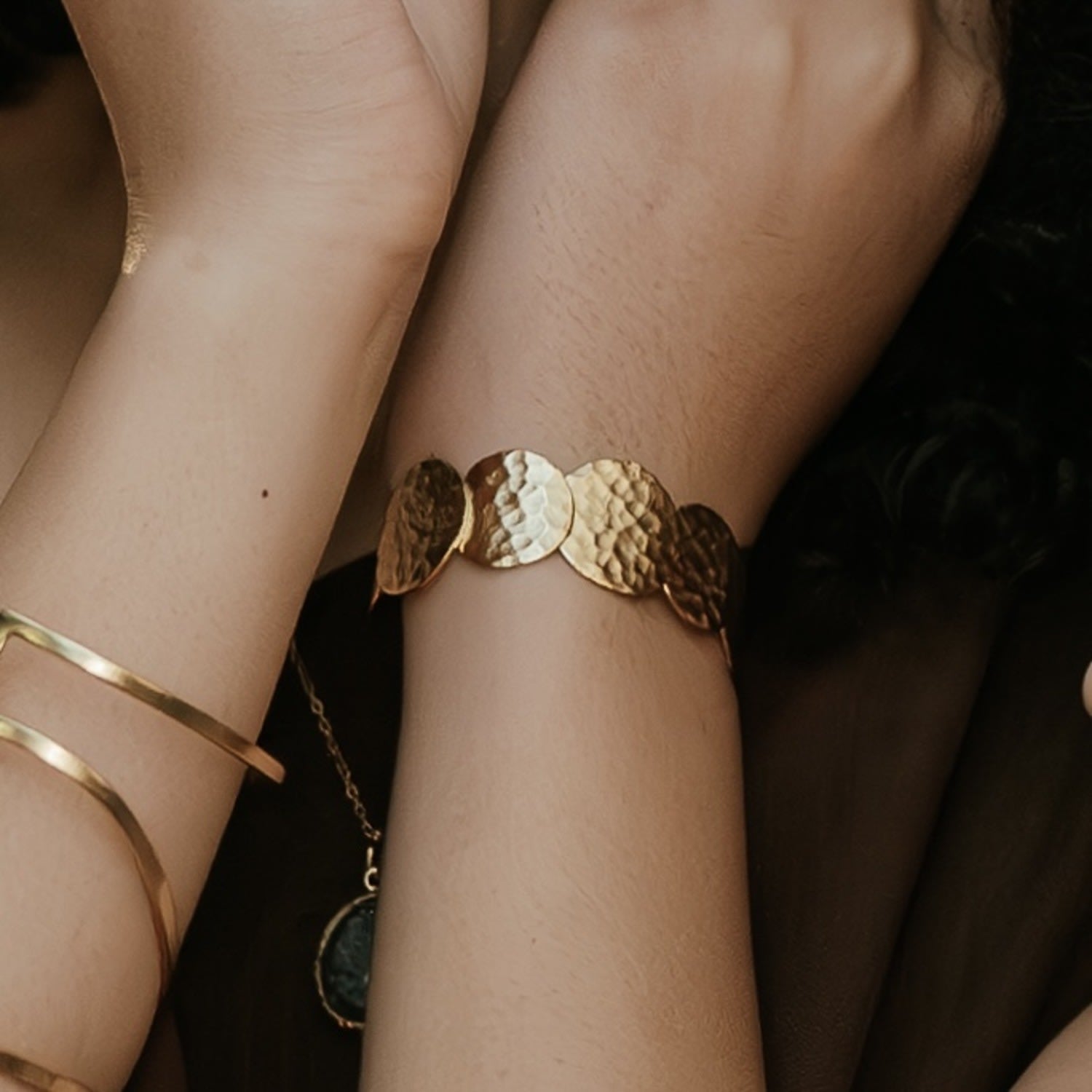 This cuff is handcrafted from 21-karat gold-plated brass metal with a lacquer coating and is adjustable.