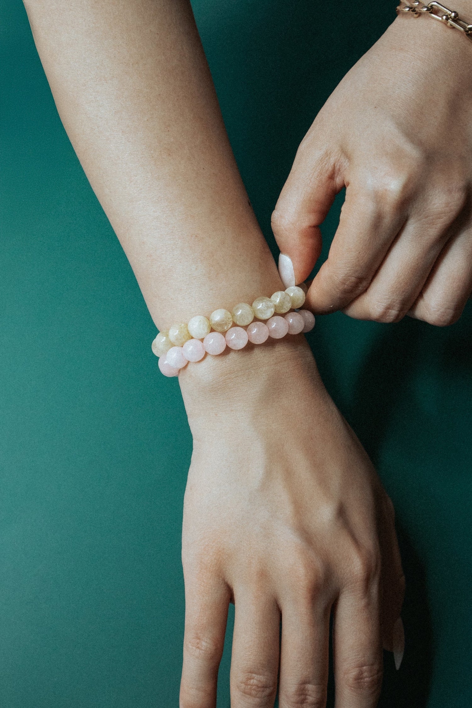 Natural rose quartz crystal beads, hand-carved and polished. Stretch design with velvet pouch and intention card. Handmade craftsmanship.