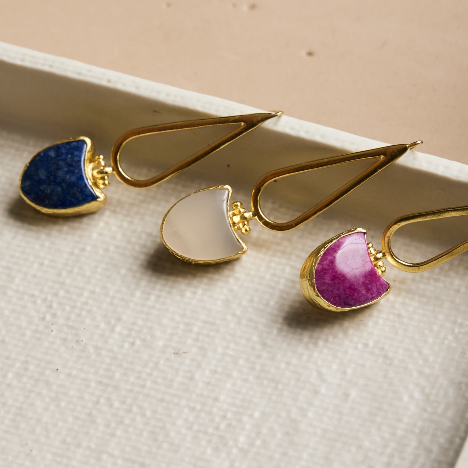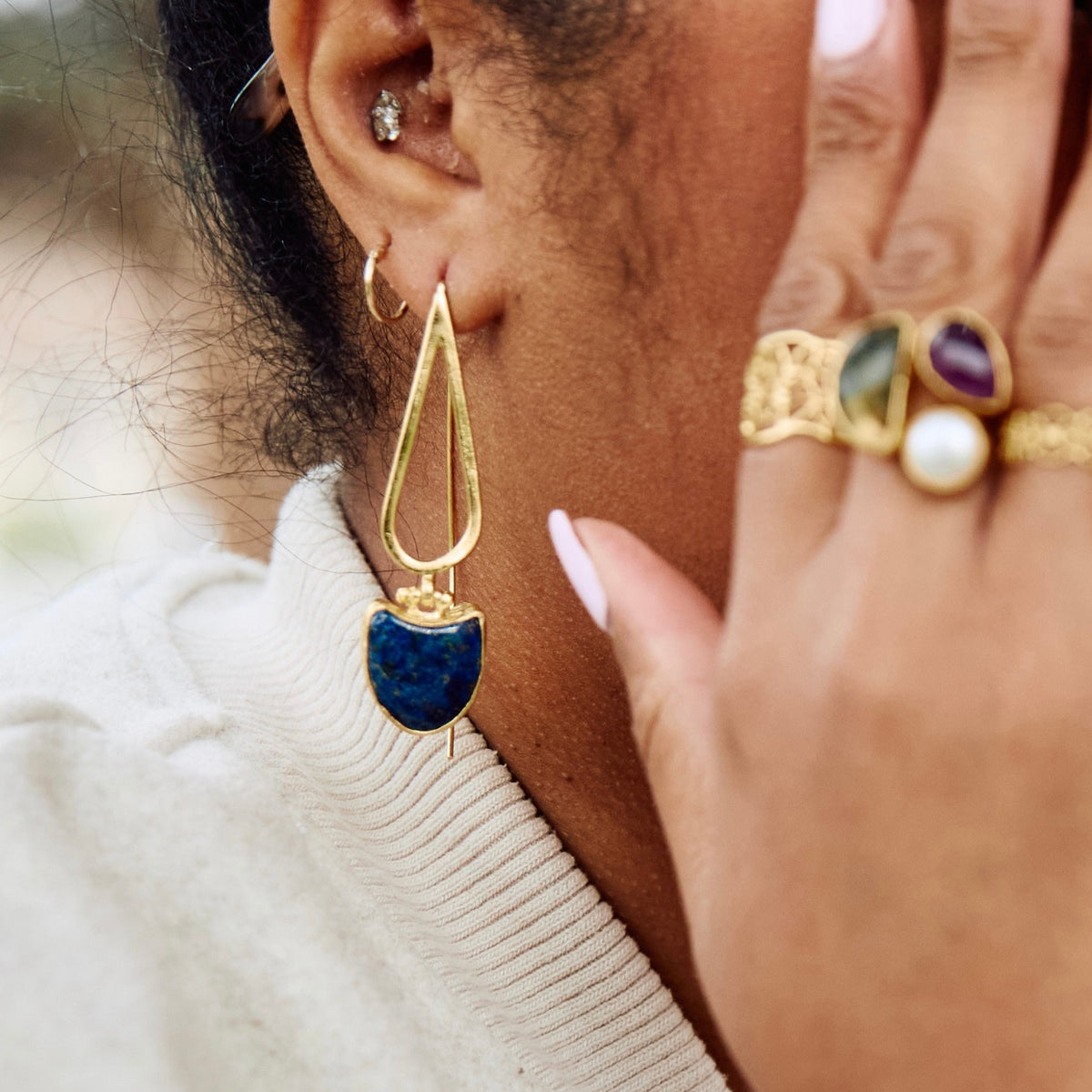 These Arianna Earrings - Lapis Lazuli by Rōz are the perfect lightweight and elegant drop earrings. The beautiful teardrop shape is finished with a half-circle lapis lazuli stone, creating a unique and sophisticated silhouette. These push-back earrings are a versatile accessory, perfect for adding a touch of refined beauty to your look.