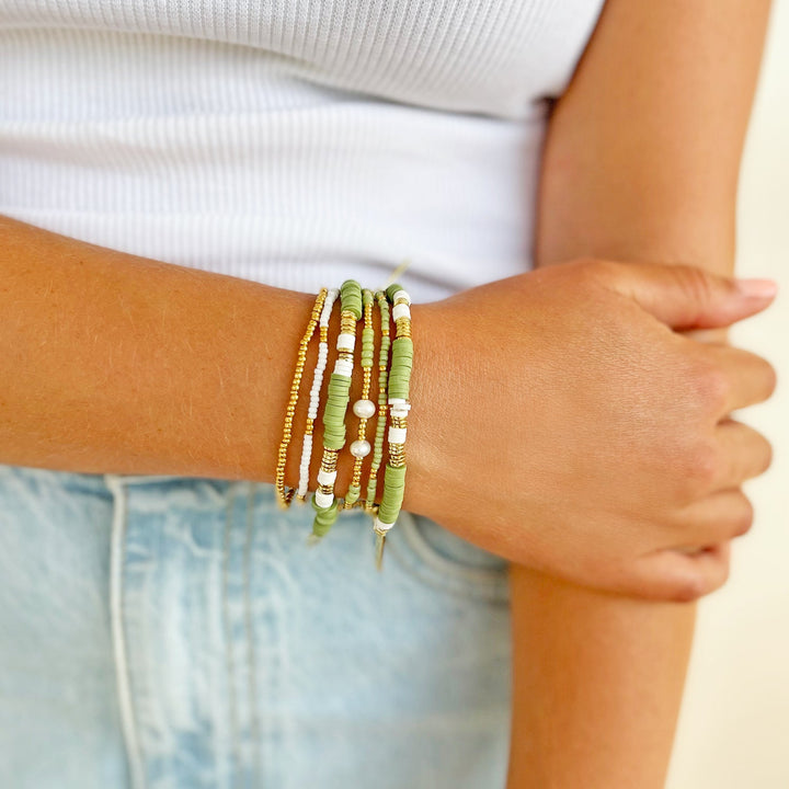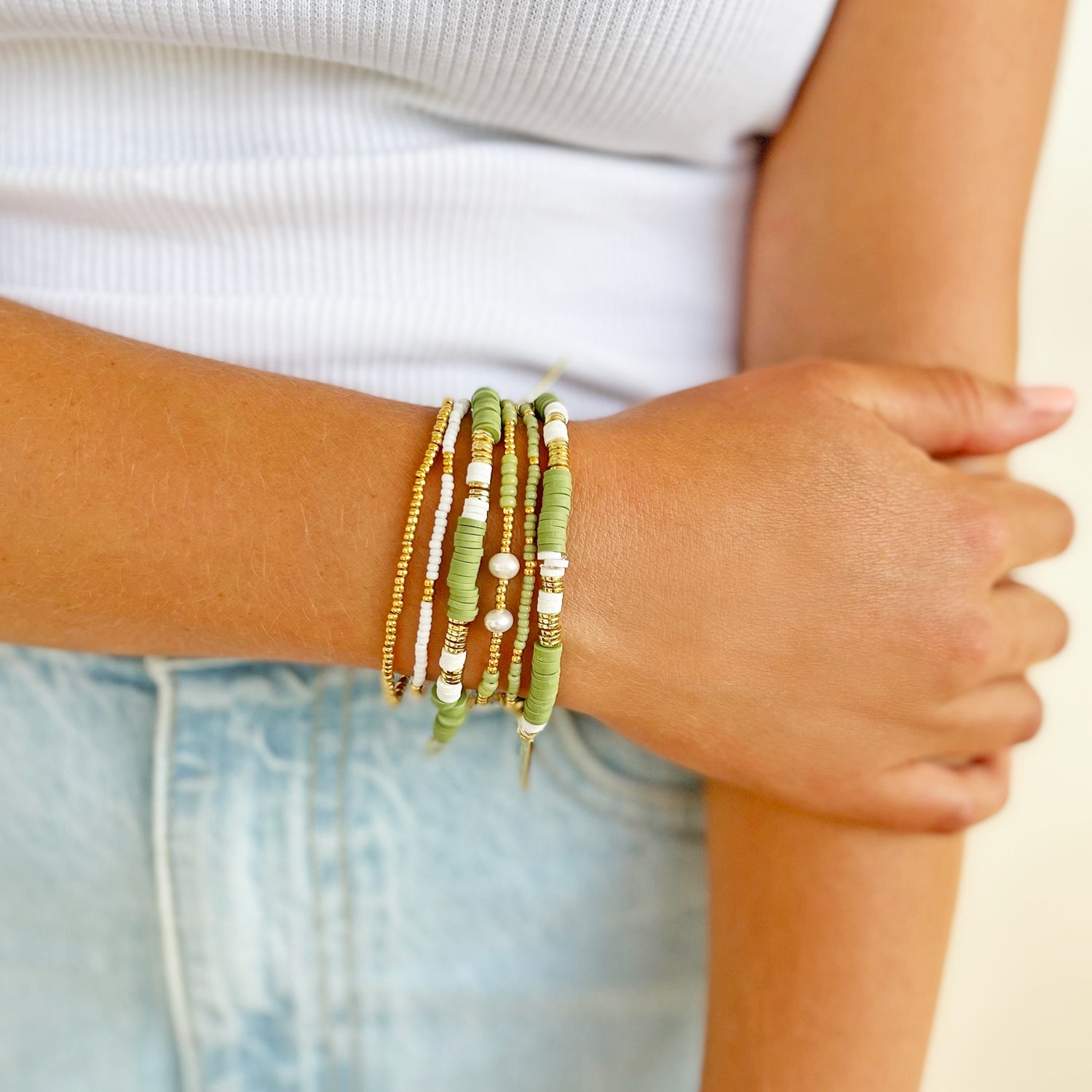The Amari Bracelet - Forest by Arms of Eve is a trendy, bright-colored bracelet perfect for a beach-inspired style. It can be stacked, mixed, and matched to create a unique look. The bracelet is suitable for daily wear and is designed to be tarnish-free and durable. It's also 100% nickel and lead-free.