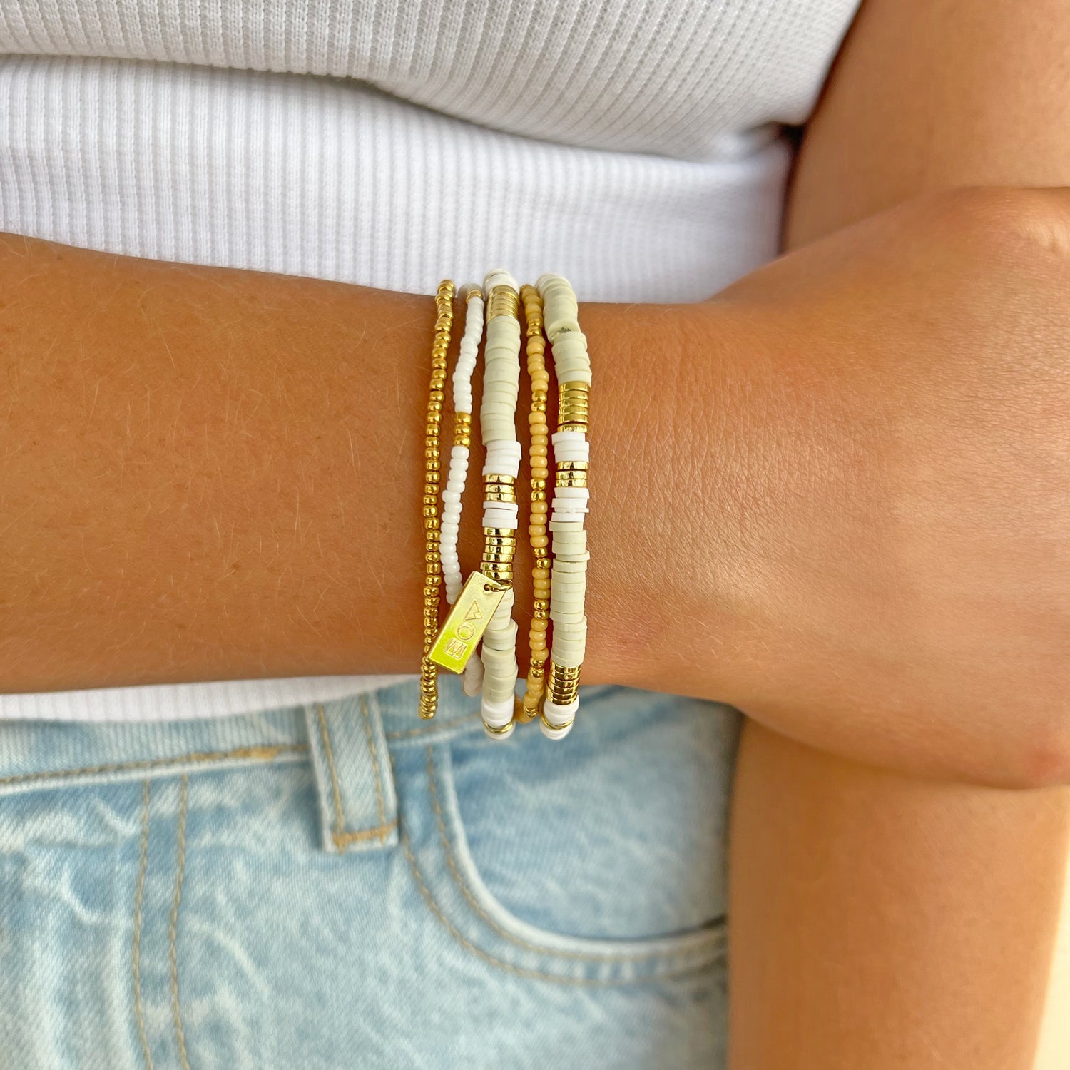 These Amari Bracelets - Sand by Arms of Eve are designed to add a bright and vibrant touch to your style. With their cool, colorful beaded design, they are the perfect accessory to get you ready for summer and beyond. The bracelets are ideal for stacking and mixing and matching, allowing you to create a unique and personalized look that reflects your individuality. They embody a playful, bohemian vibe that brings joy and effortless style to your wrist.