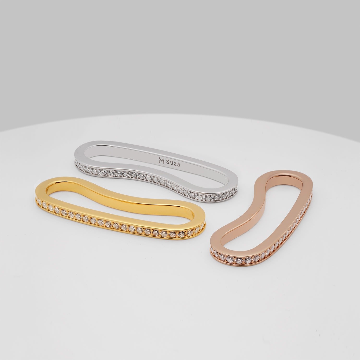 This Long Curvy Thin Bar Ear Cuff with Pavé CZ in Rose Gold by Meulien is an elegant exploration of fluid form. Its gently rippling contour flows along the ear, adorned with sparkling pavé-set stones that shimmer with subtle brilliance. Worn at the top of the ear, it appears to float gracefully, creating a modern and refined statement. A piece of understated glamour, it’s perfect for those who love sculptural jewelry with a delicate edge.
