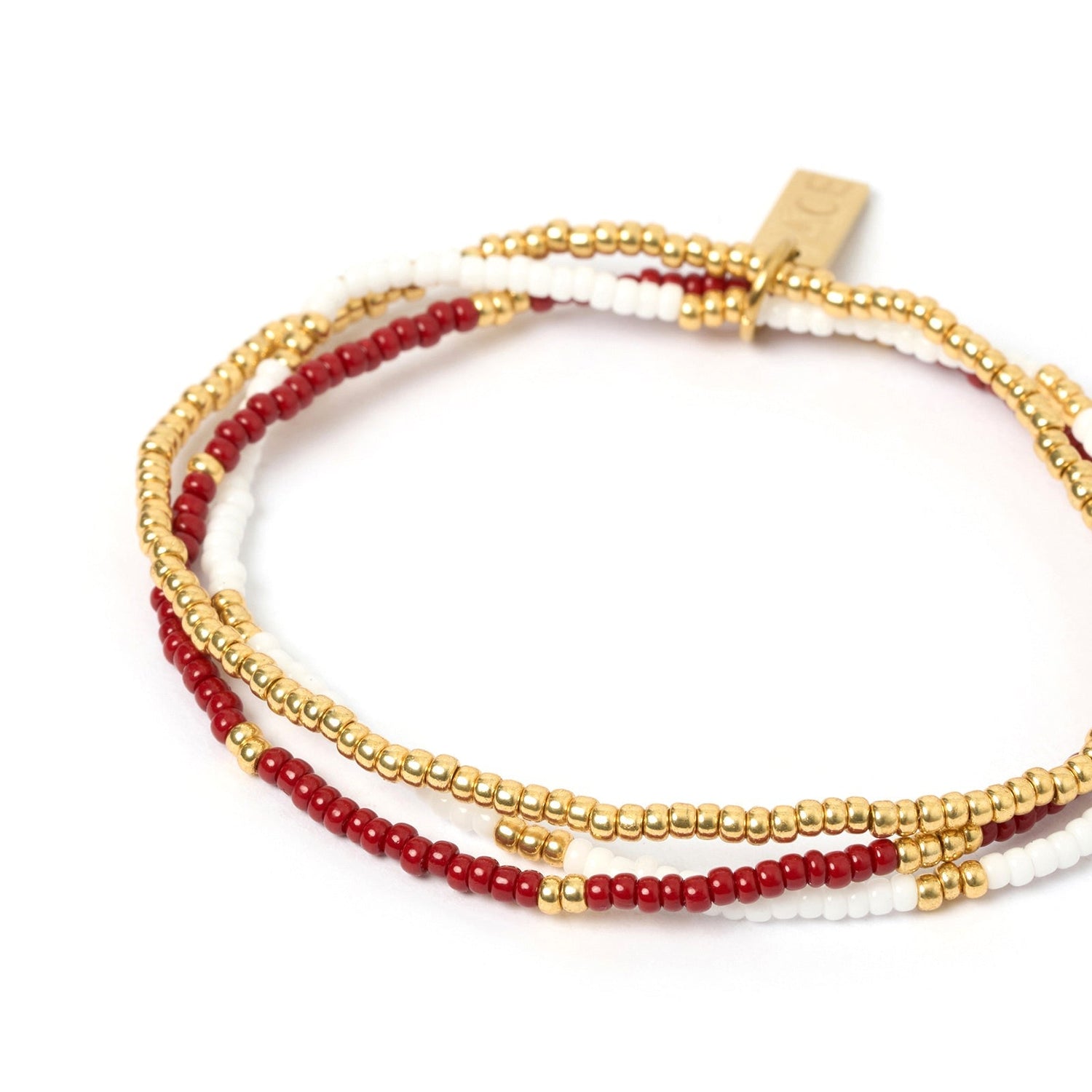 This Sunny Bracelet Set - Burgundy by Arms of Eve is a trendy and fun accessory. The set features three beaded beauties: one gold, one white, and one burgundy. This set helps you mix up your style and make it fun, perfect for stacking high for a confident and playful look.