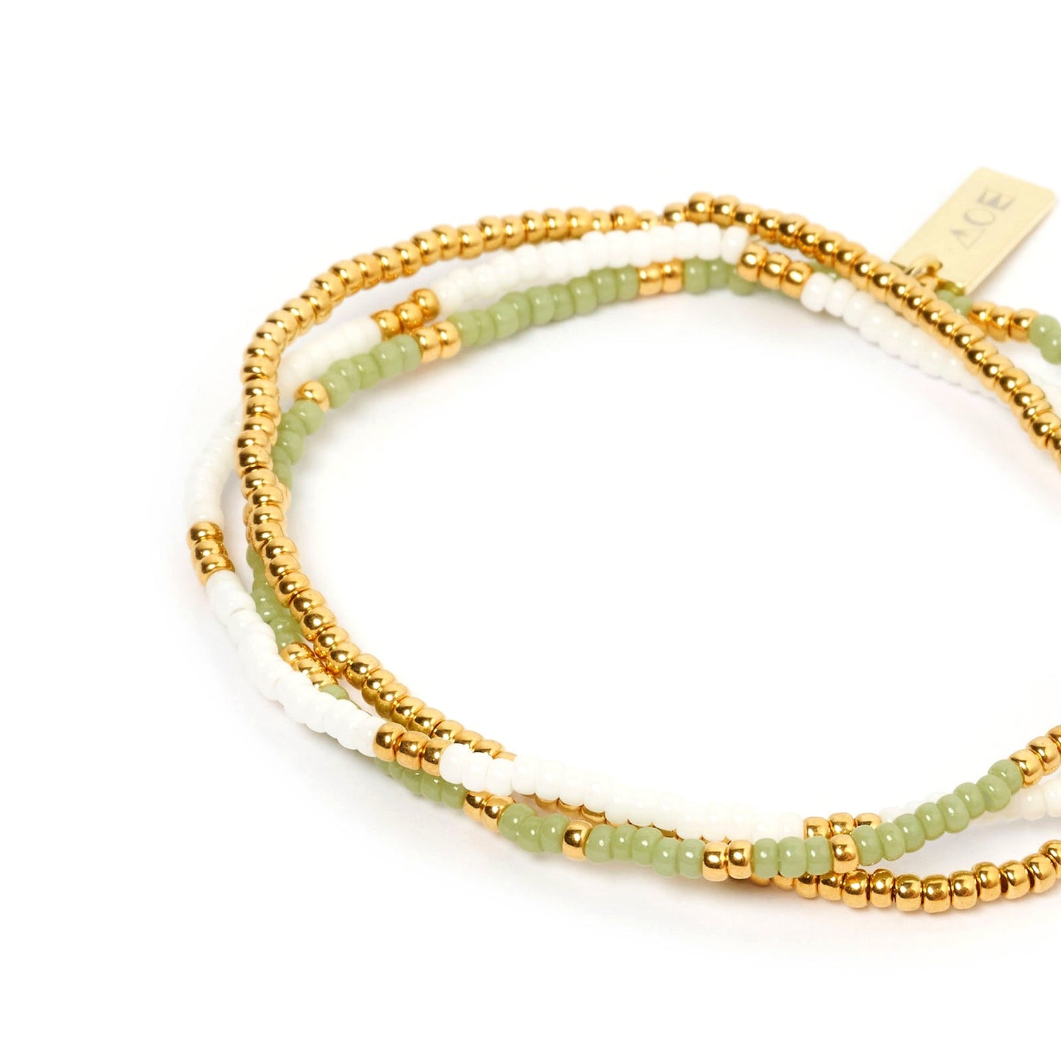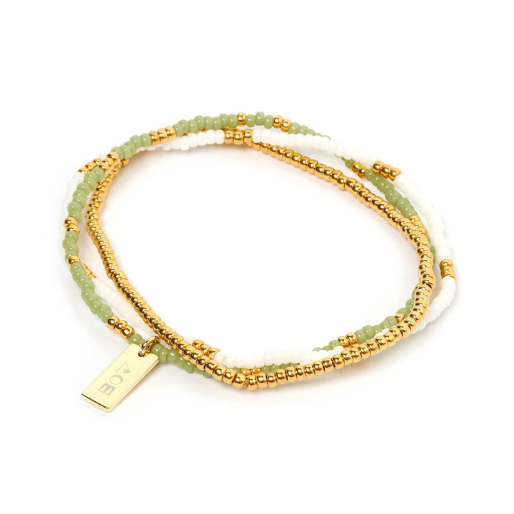 This set includes three beaded bracelets: one gold, one white, and one green. The jewels are 100% nickel- and lead-free and are plated 2 microns thick in 18k Gold with an e-coating for a premium finish.