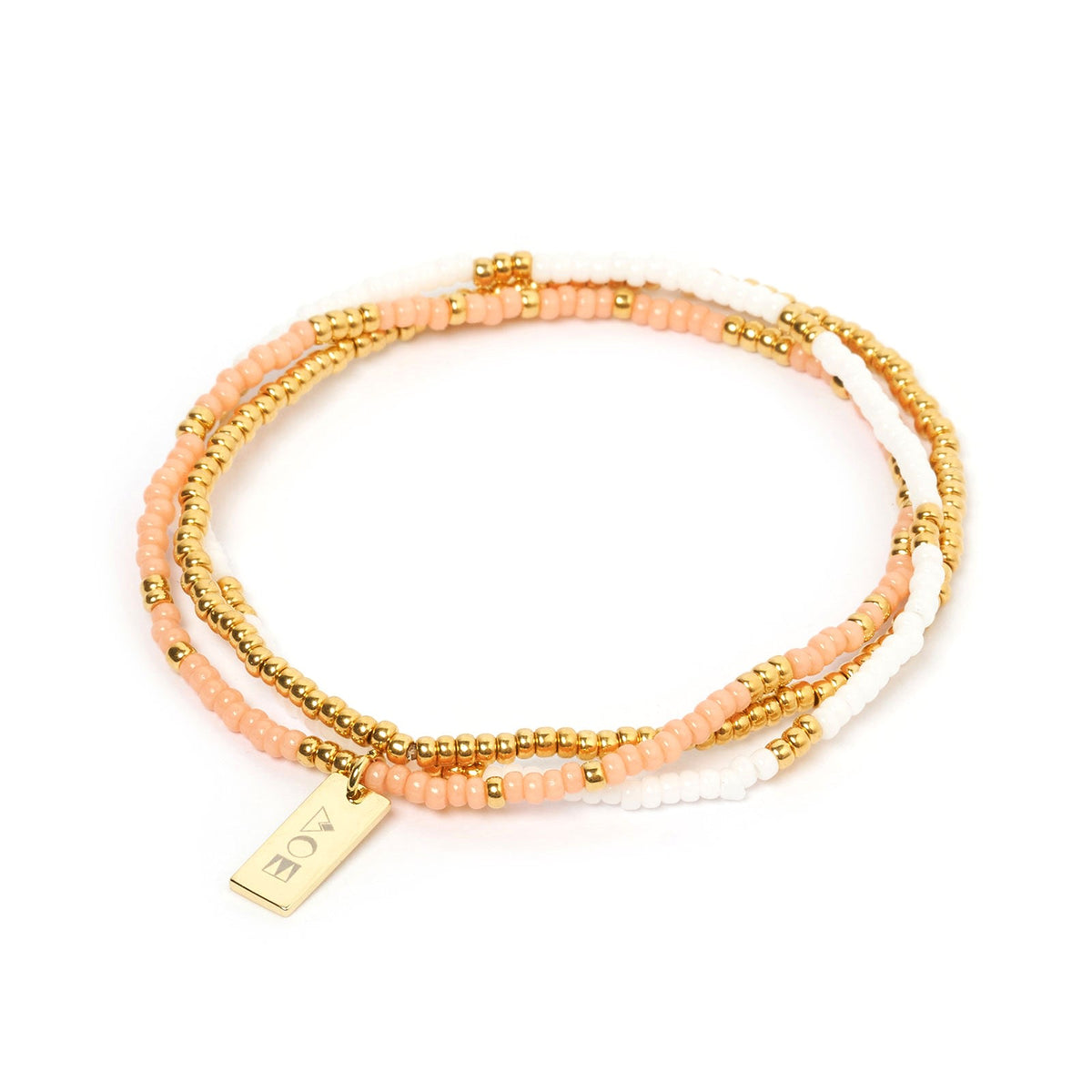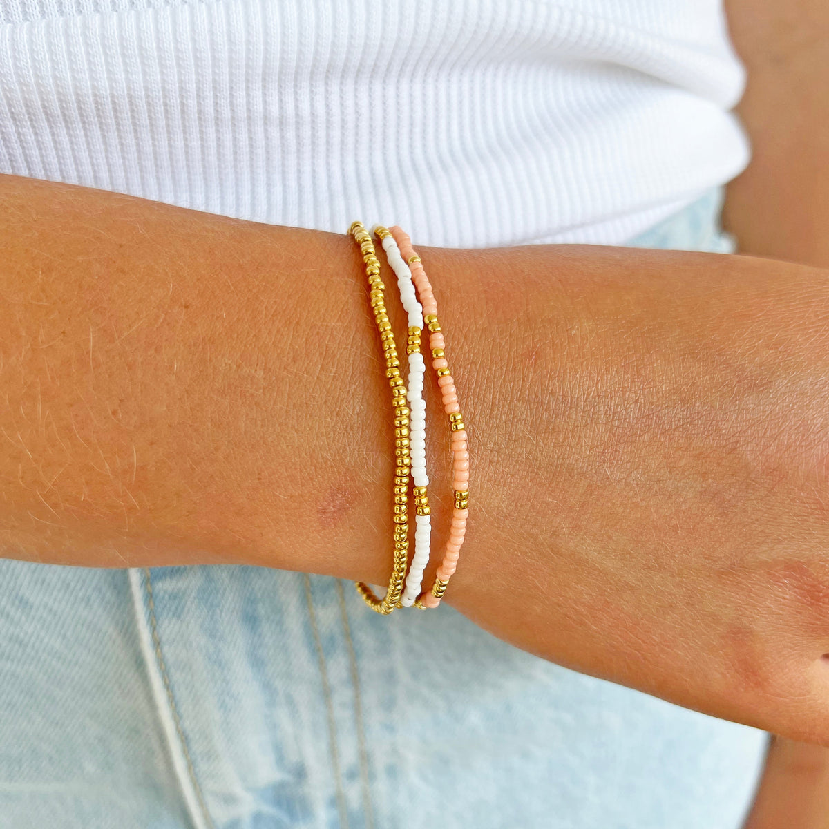 This set includes three beaded bracelets: one gold, one white, and one pink. The jewels are 100% nickel- and lead-free and are plated 2 microns thick in 18k Gold with an e-coating for a premium finish.