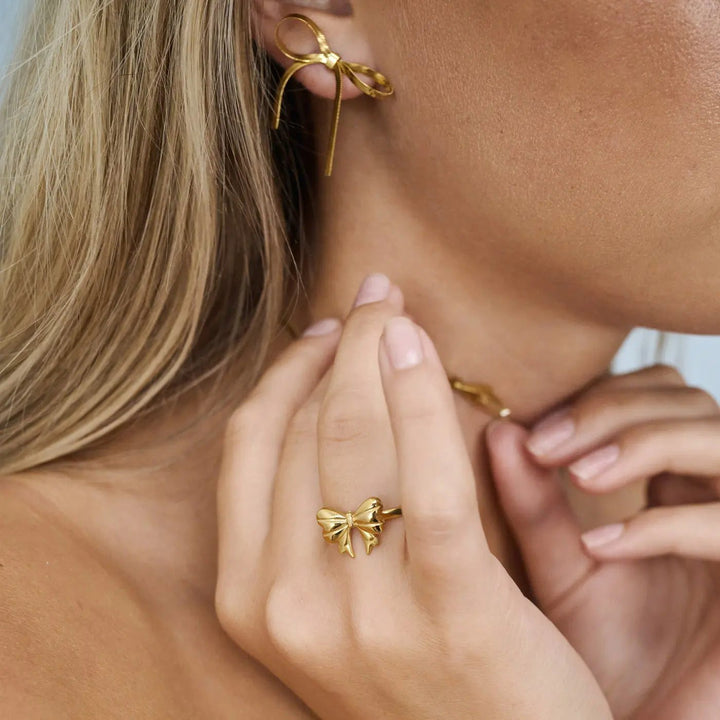This Juliette - Bow Ring by Timi of Sweden is a playful and elegant accessory that adds a touch of sweetness to your style. Its perfect tied bow design with a sleek metal finish is both adorable and sophisticated. Made of stainless steel with 18k real gold plating, this ring is water-resistant and won’t tarnish, making it a durable and worry-free piece for everyday wear.
