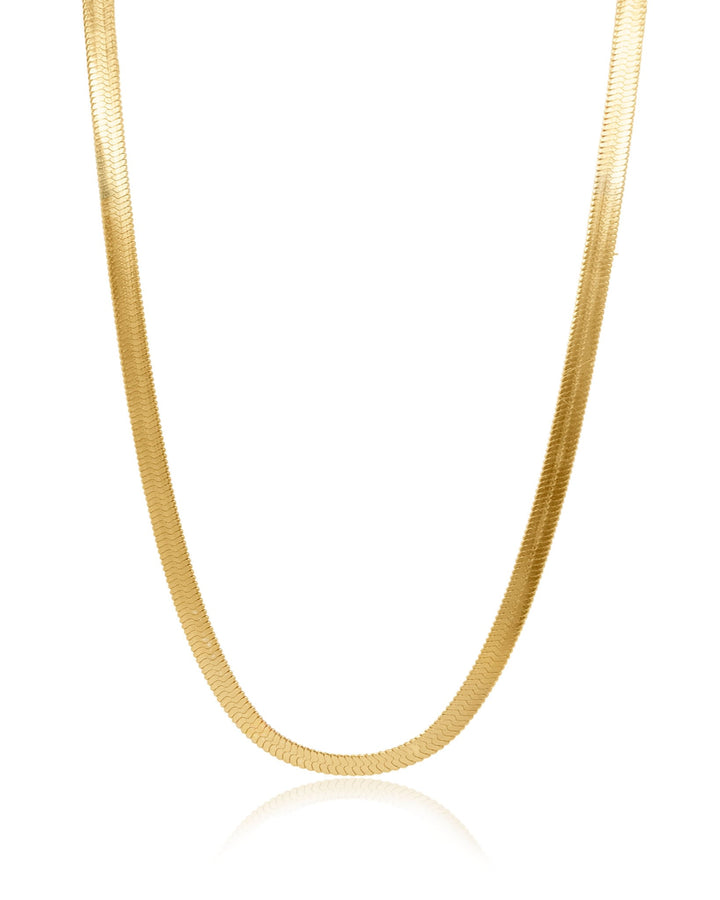 This necklace is made from high-quality 18k gold-coated stainless steel. It features a flat herringbone chain with a lobster clasp closure and is hypoallergenic, waterproof, and non-tarnish.