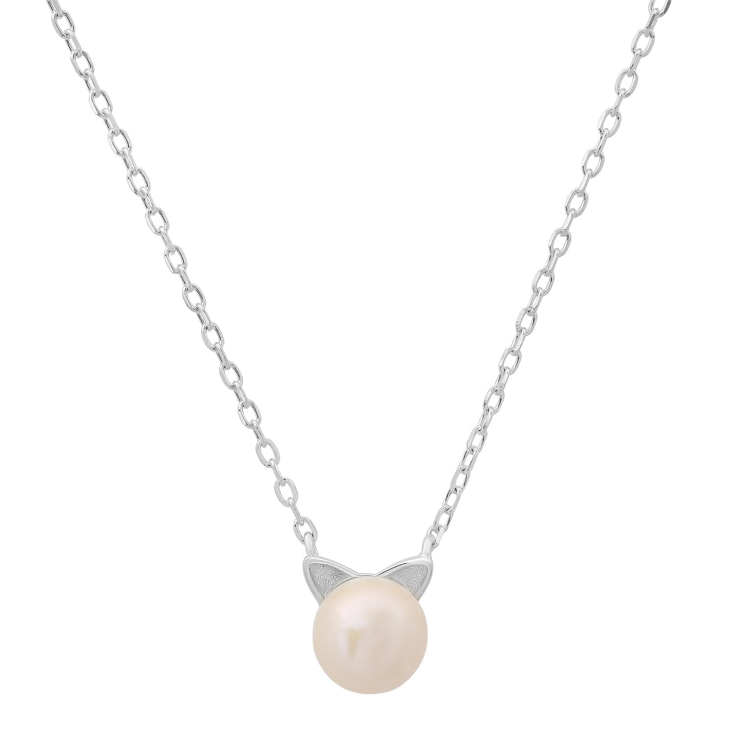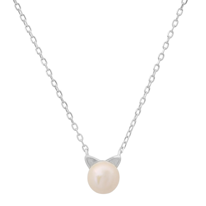 This pendant necklace is crafted from genuine 925 sterling silver and features a kitty cat design with a 7-8mm genuine freshwater pearl.