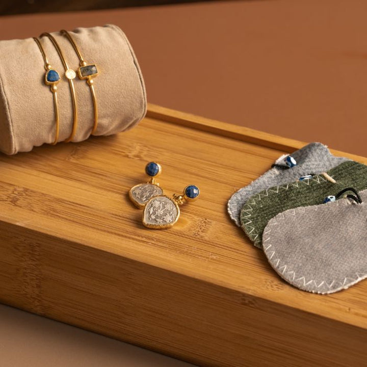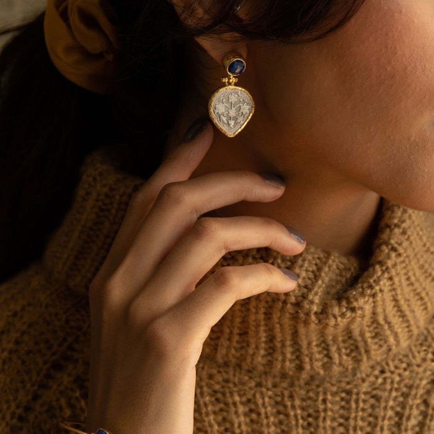 These Hala Earrings by Rōz are a gorgeous and limited-edition accessory. The tear drop design features a lapis lazuli stone and matte silver engraving, creating a beautiful blend of traditional craftsmanship and modern design. These earrings are a perfect statement of unique and artistic style.