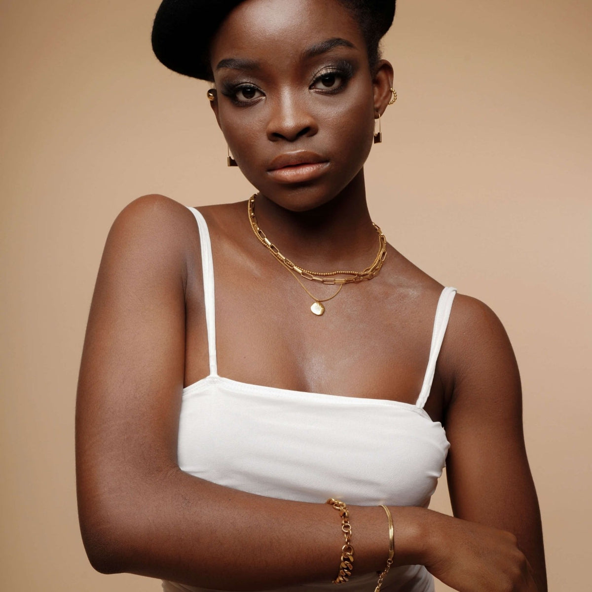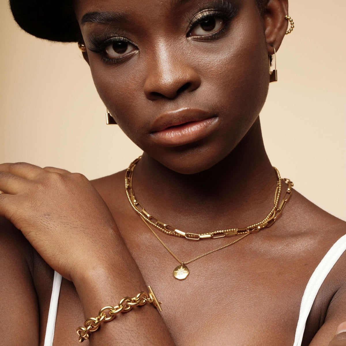 Made from high-quality 18ct gold-coated stainless steel. Hypoallergenic, waterproof, and non-tarnish. Secured with lobster claw clasp.