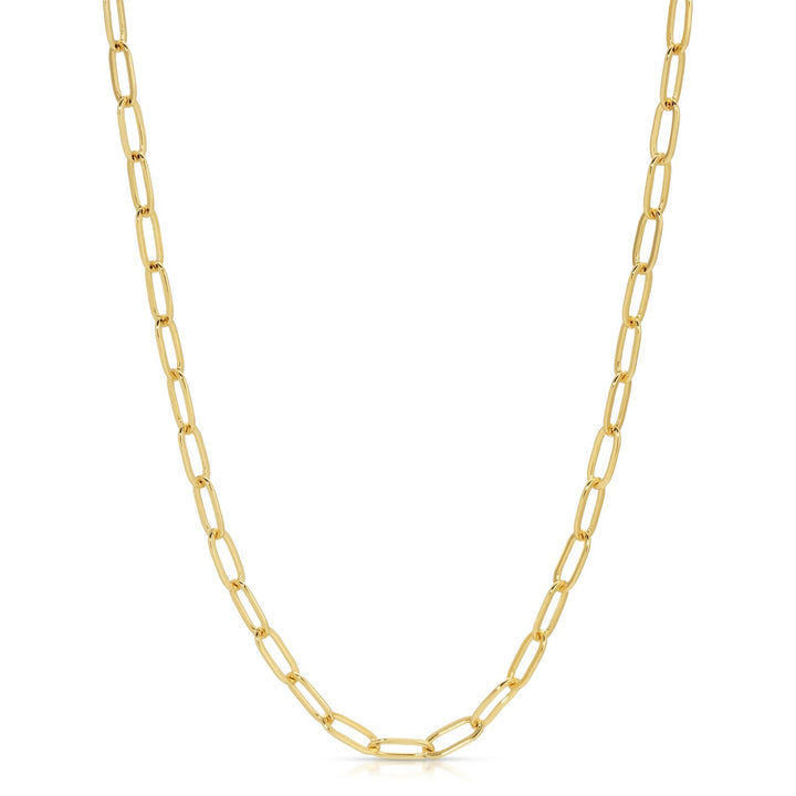 This Abbi Chain Necklace by Leeada Jewelry is a perfect layering necklace, designed to be a versatile and modern staple in your collection. Crafted from 14k gold-plated brass with a heavy 1-micron plating, this paperclip chain necklace is both durable and stylish. Its simple, classic design makes it the ideal first layer for adding your favorite charms or other necklaces, allowing for a personalized and chic look.