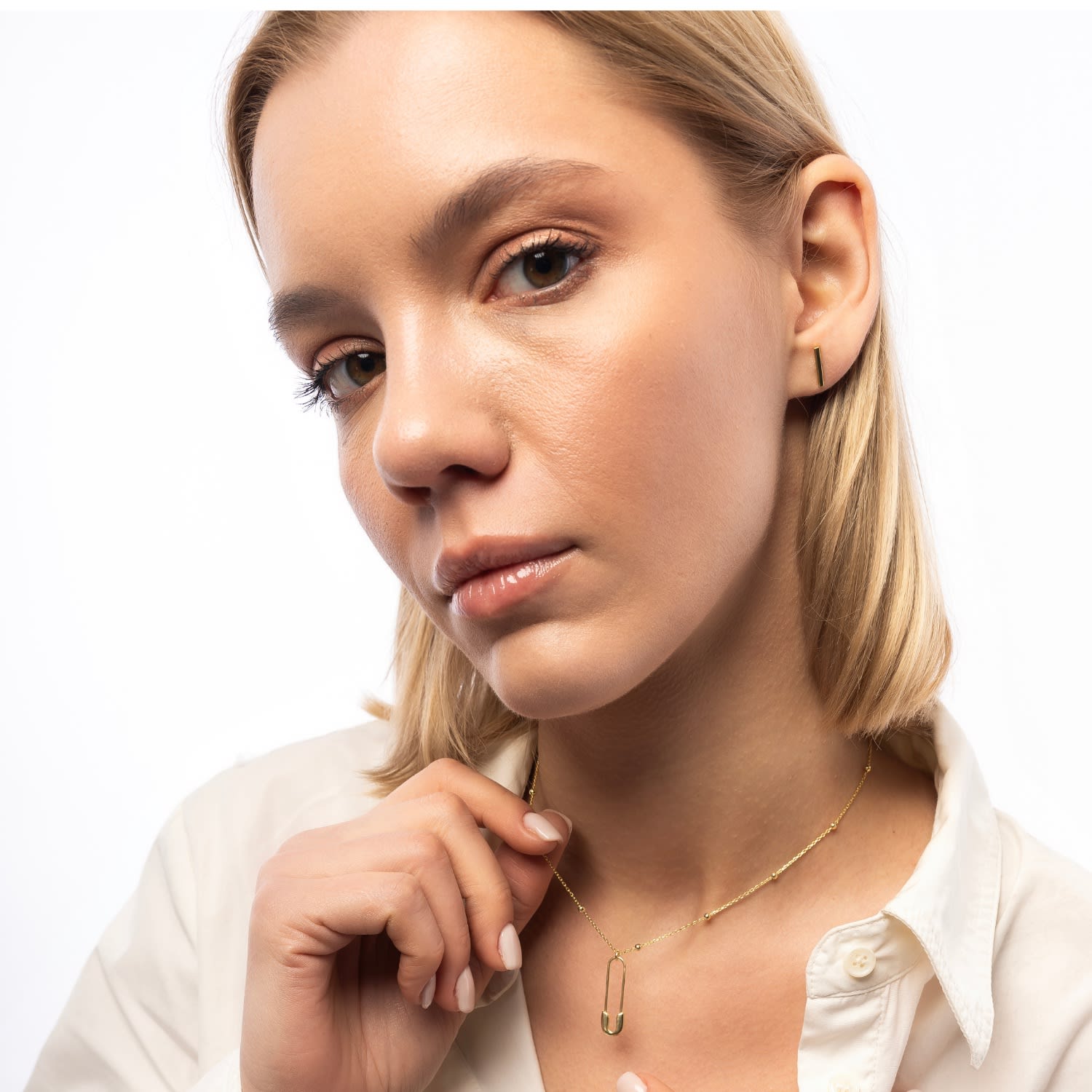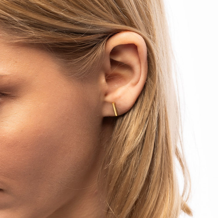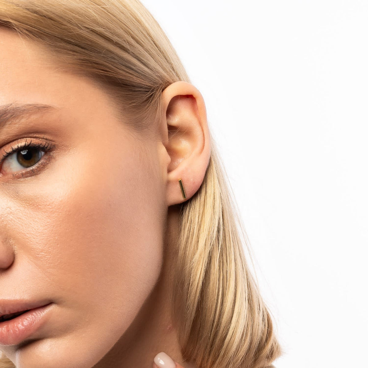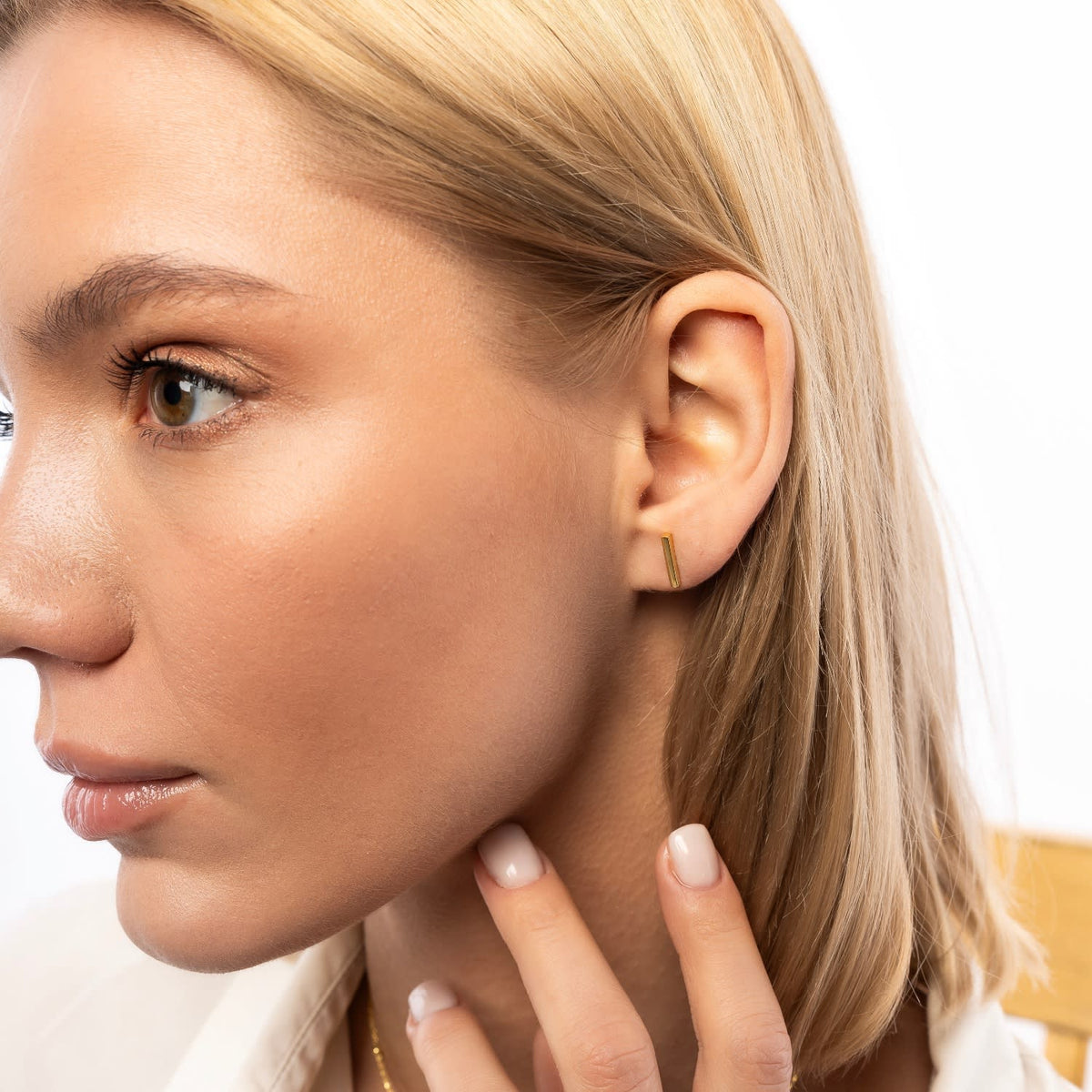 These stud earrings are crafted from 925 recycled sterling silver with a gold tone. They feature a bar shape adorned with cubic zirconias and a post-back lock.