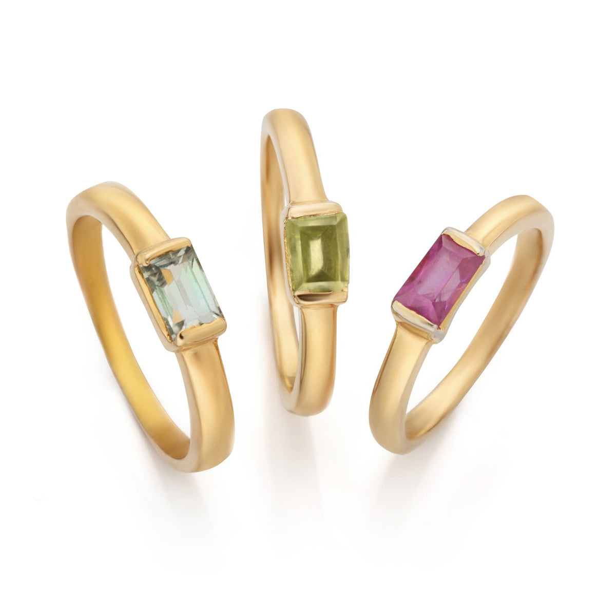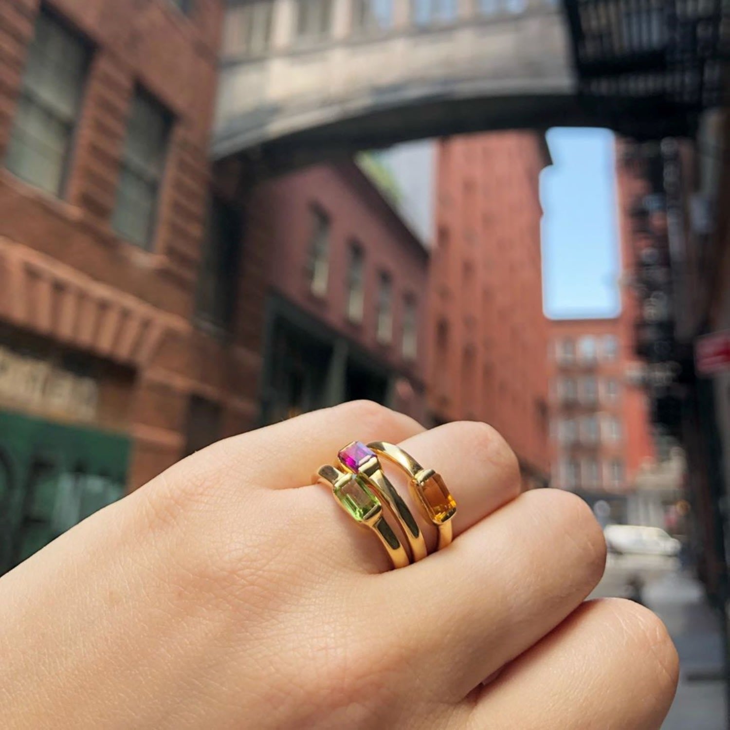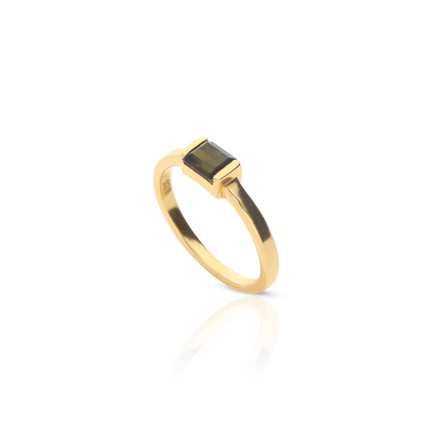 This 14K Gold Plated Stone Ring - Green Tourmaline by Preeti Sandhu is a simple yet elegant ring that highlights the natural beauty of a green tourmaline gemstone. The deep, lustrous stone is set in 14k gold-plated sterling silver. This ring is perfect for wearing alone for a subtle statement or stacking with other rings to create a personalized look. The expert artisanship and nickel-free materials ensure a high-quality and beautiful piece.