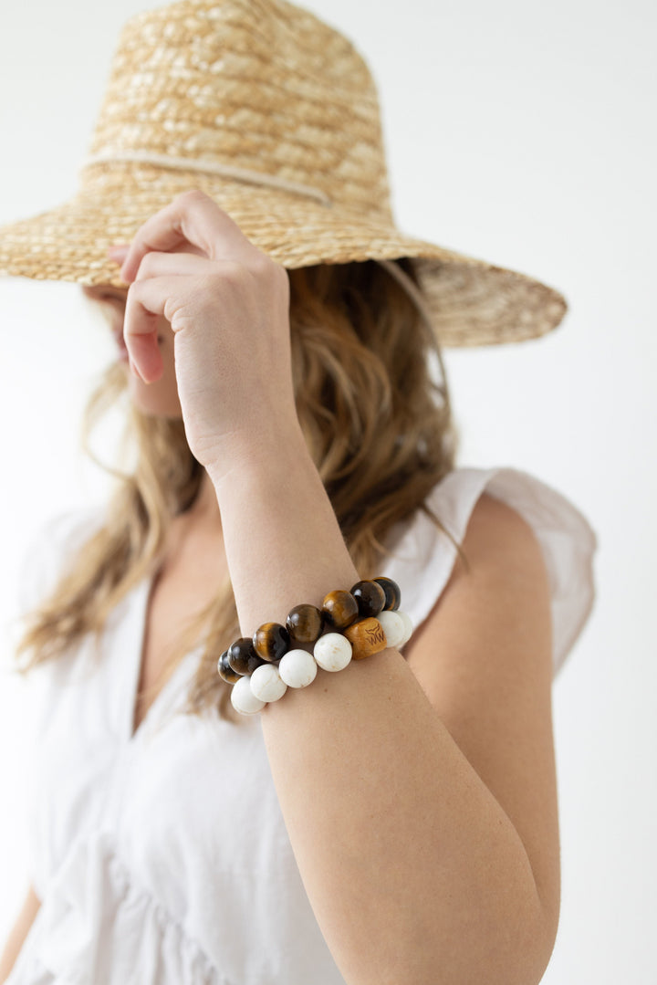 This The Dune Bracelet by Whale Tail Weaving is a beautiful and unique accessory designed for year-round wear. Handcrafted with Tiger's Eye stones, this beaded bracelet offers a subtle yet elegant look that complements any style. Much like the natural cobblestones it is inspired by, it brings an earthy, organic feel to your wrist, encouraging you to wear woven pieces throughout all seasons. It's a versatile piece that combines natural beauty with a simple, refined aesthetic.