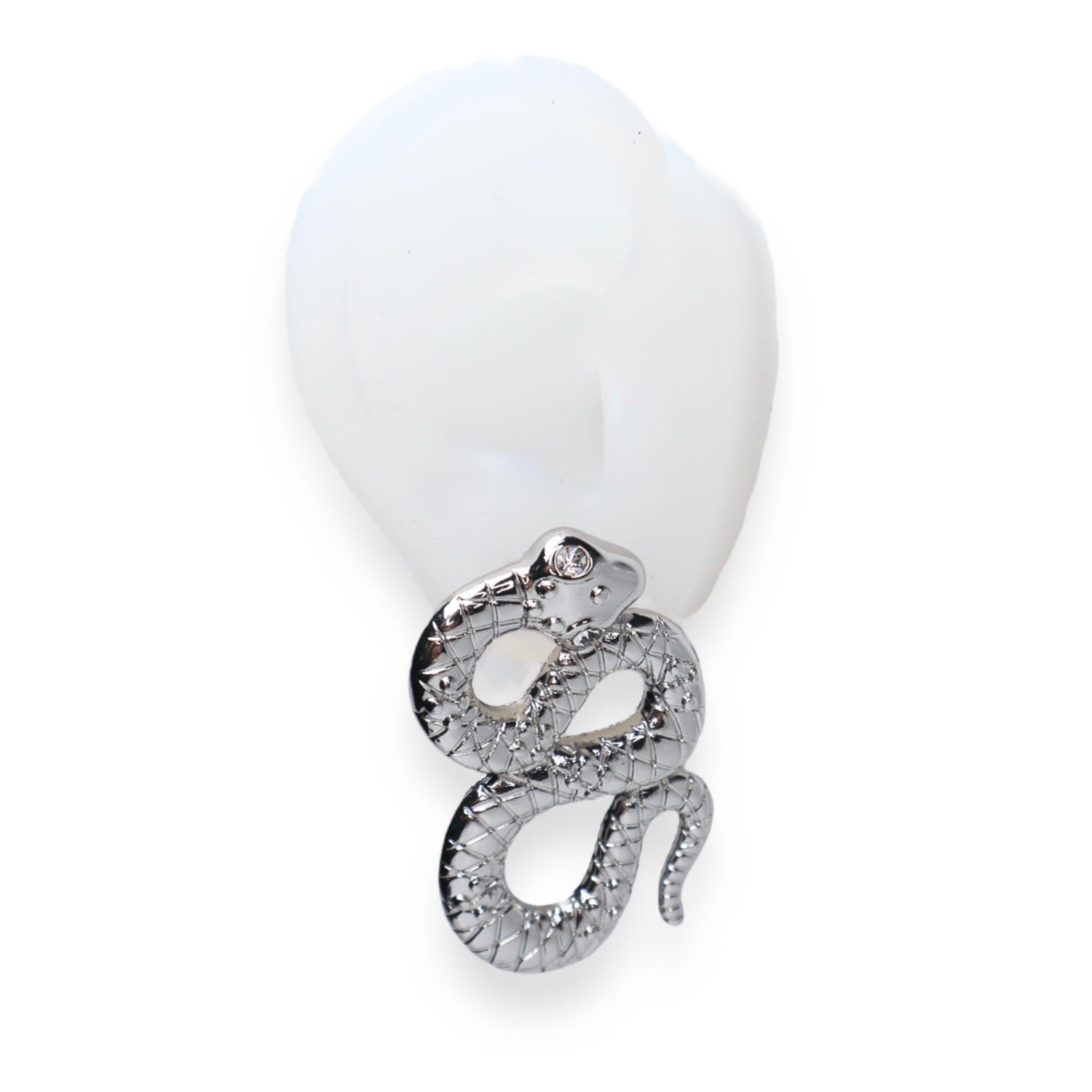 These Python Earrings In White Gold by Jagged Halo Jewelry are a stunning and lightweight pair designed to unleash your inner power. These intricate serpent earrings feature a luxurious gold-filled finish and a mesmerizing coiled design that embodies both transformation and strength. Crystal accents in the eyes add a touch of sparkle. They are perfect for adding a bold yet elegant statement to any outfit, balancing edge and glamour for any occasion.