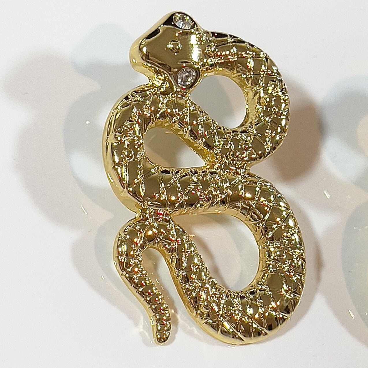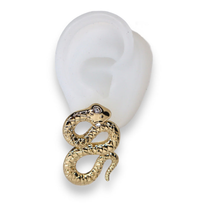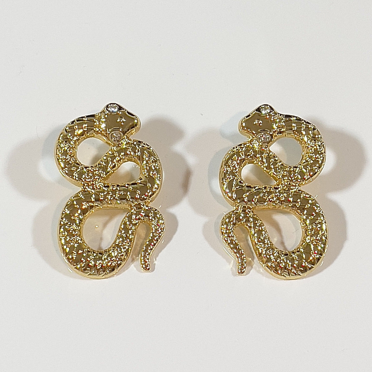 These earrings are crafted from gold-filled material. They are designed in a serpentine pattern and have crystal accents in the eyes. The earrings are also lightweight.