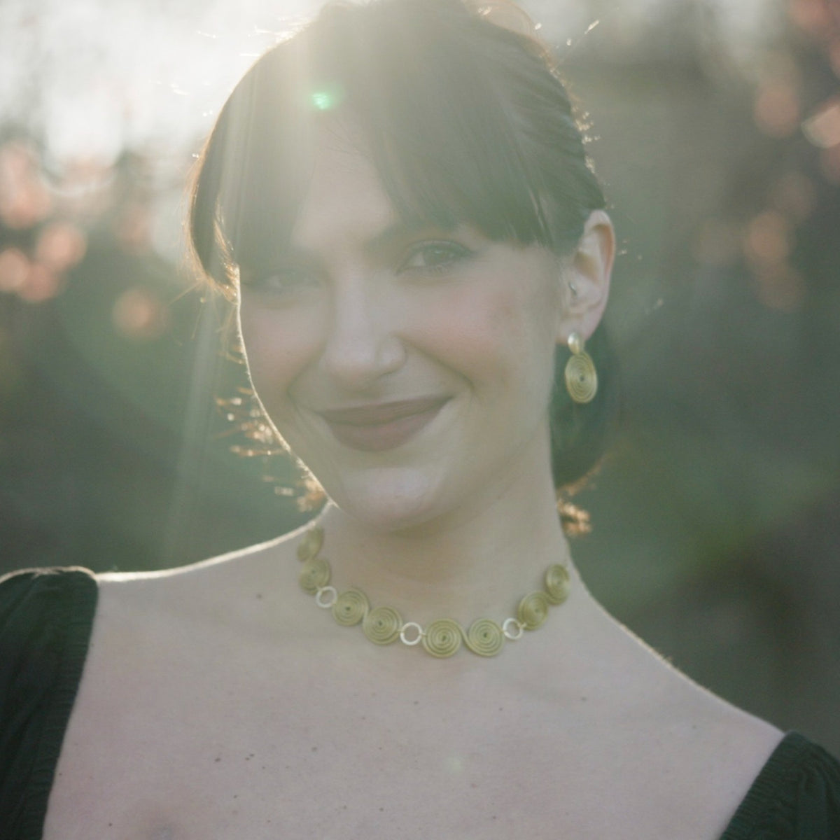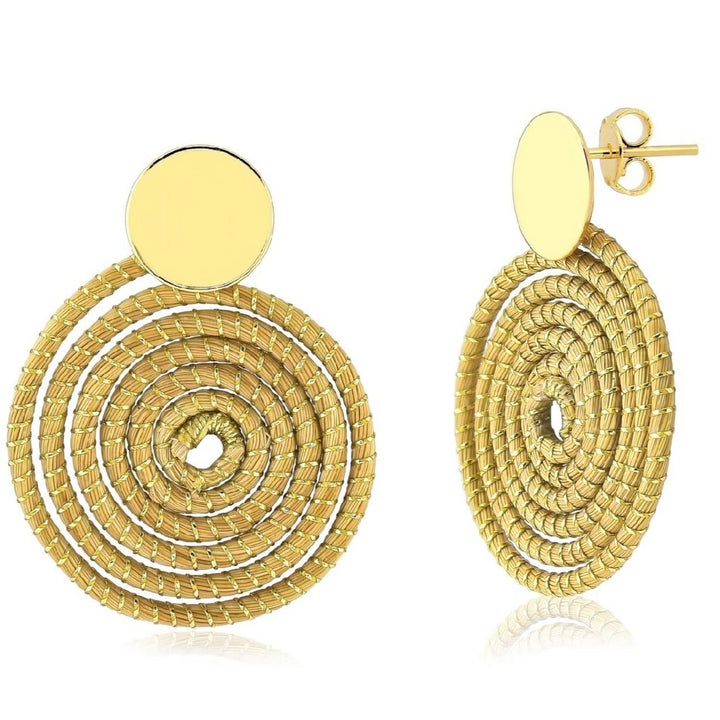 Handwoven from golden grass and golden nylon thread. 18k gold plated recycled brass. Hypoallergenic, nickel-free.