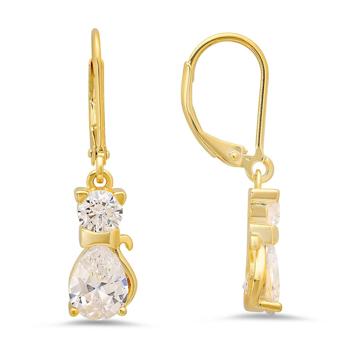 Gold Dangling Kitty Cat Diamond Cz Leverback Earrings