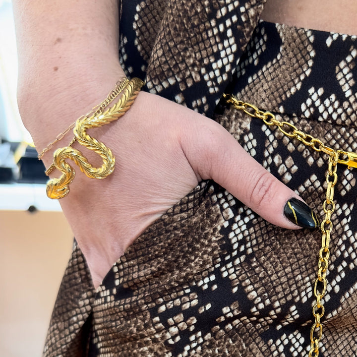 This Serpent Cuff Bracelet Silver by Jagged Halo Jewelry is sleek and symbolic. Inspired by the serpent, it represents resilience and transformation, wrapping around the wrist in a bold minimalist form. Designed for versatility, it transitions seamlessly from edgy daywear to powerful evening styling.