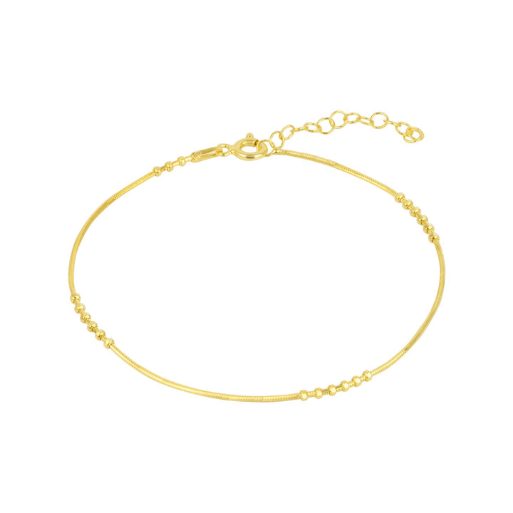 925 recycled sterling silver base plated in gold; dainty chain with six polished bead accents; spring-ring clasp with extender.