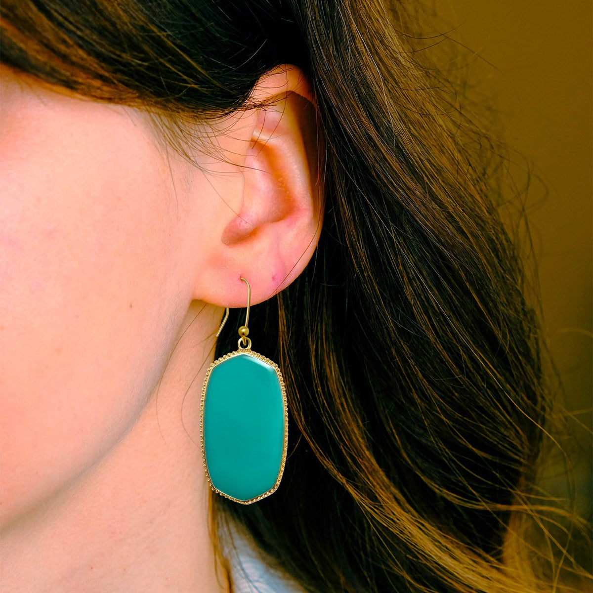 These Turquoise Hand Enameled Drop Earrings On French Wire by Michael Nash Jewelry are a mesmerizing accessory with a vibrant pop of color. They are hand-enameled and gold-plated brass earrings, featuring a pure turquoise hue that is a stunning testament to nature's allure. They are delicately suspended from a French wire and can effortlessly complement a range of colors, making them a versatile and sophisticated choice for any occasion.