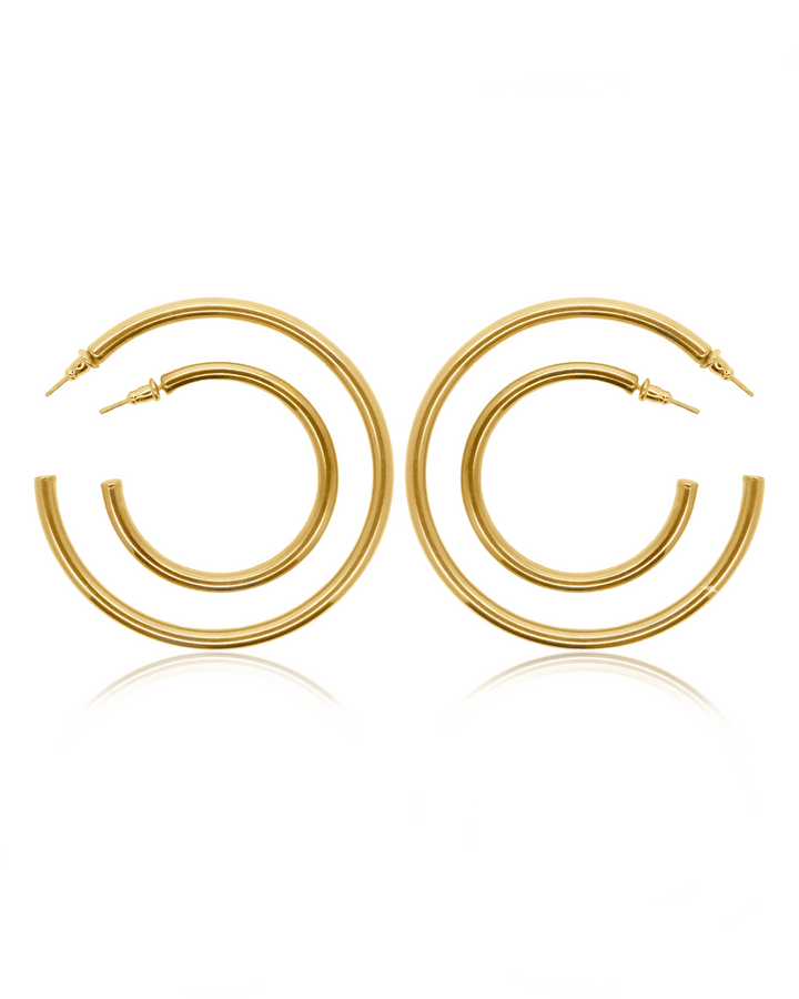 Handcrafted from high-quality 18k PVD gold coated stainless steel. Hollow tube hoop design with push-back closure. Hypoallergenic, waterproof, and non-tarnish.