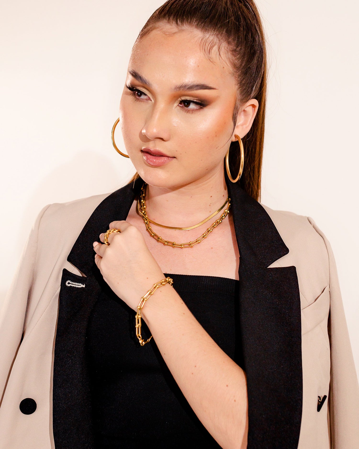 These Callista Statement Hollow Tube Hoop Earrings by Viea embrace bold elegance through their sculptural silhouette. Available in three sizes, they allow for playful styling—whether worn alone for a statement or doubled up for a daring layered effect. Their hollow tube design ensures comfort without compromising on impact, while the lustrous golden finish embodies confidence and contemporary flair. Perfect for those who love to experiment with volume and shine, they symbolize empowerment and fearless self-expression.