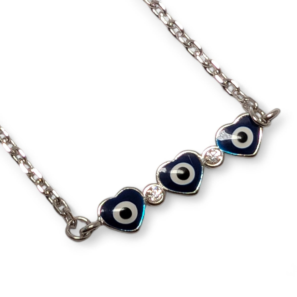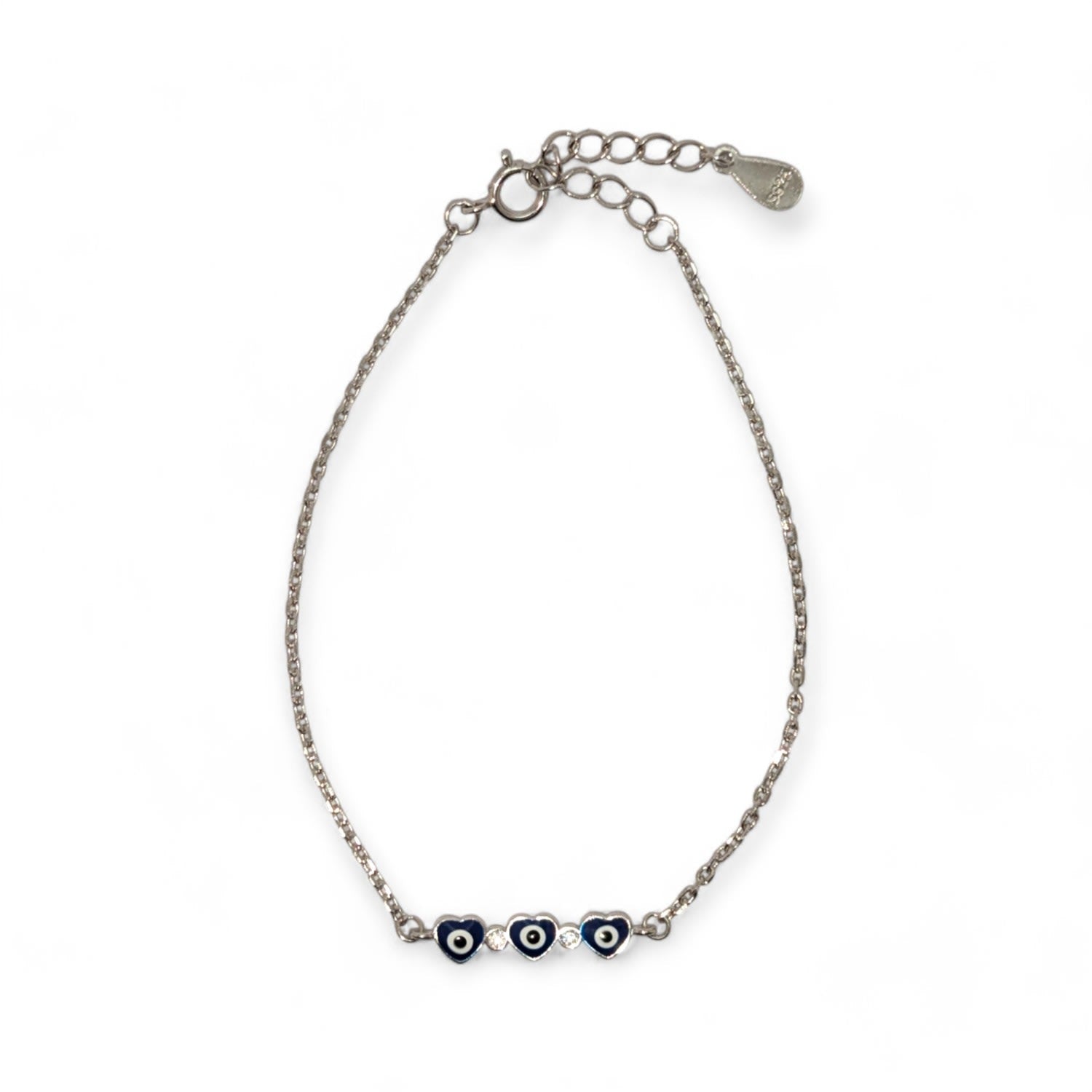 This bracelet is made of 925 sterling silver and features heart-shaped evil eyes and cubic zirconia.